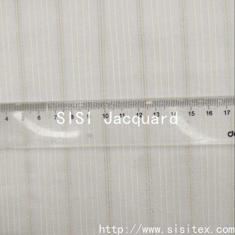 This "threaded jacquard" cotton fabric with gold and silver threads (Lurex) is made by blending 97% cotton with 3% gold and silver threads. It is woven using "60+40/2+80D T*60" fine-spun yarns and a 100*80 warp and weft density. The width is 145cm and the weight is only 71g/㎡. The fabric is lightweight and breathable, with a delicate jacquard weave that creates rhythmic geometric patterns. The unique gold and silver threads are interwoven into the cotton fibers, reflecting a luxurious shimmering effect as the light changes, creating a delicate and shiny visual effect on the soft cotton base. The fabric combines the natural comfort of cotton with the modern opulence of metallic elements, making it suitable for creating light and luxurious clothing and home items.