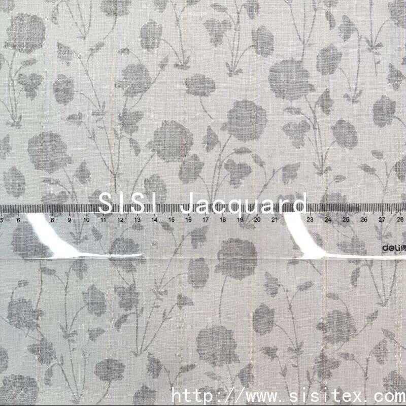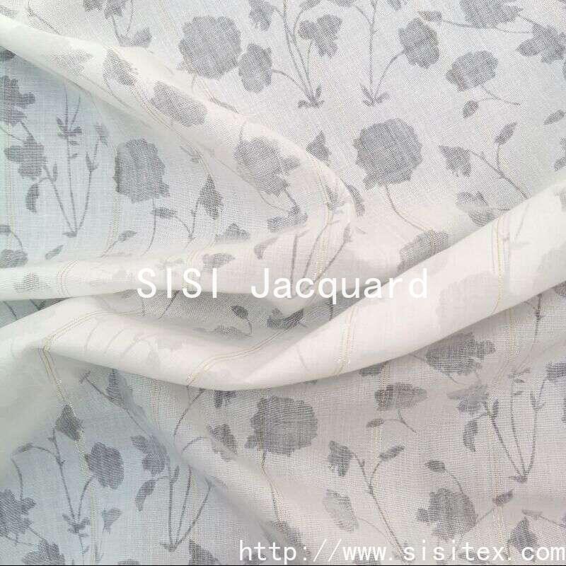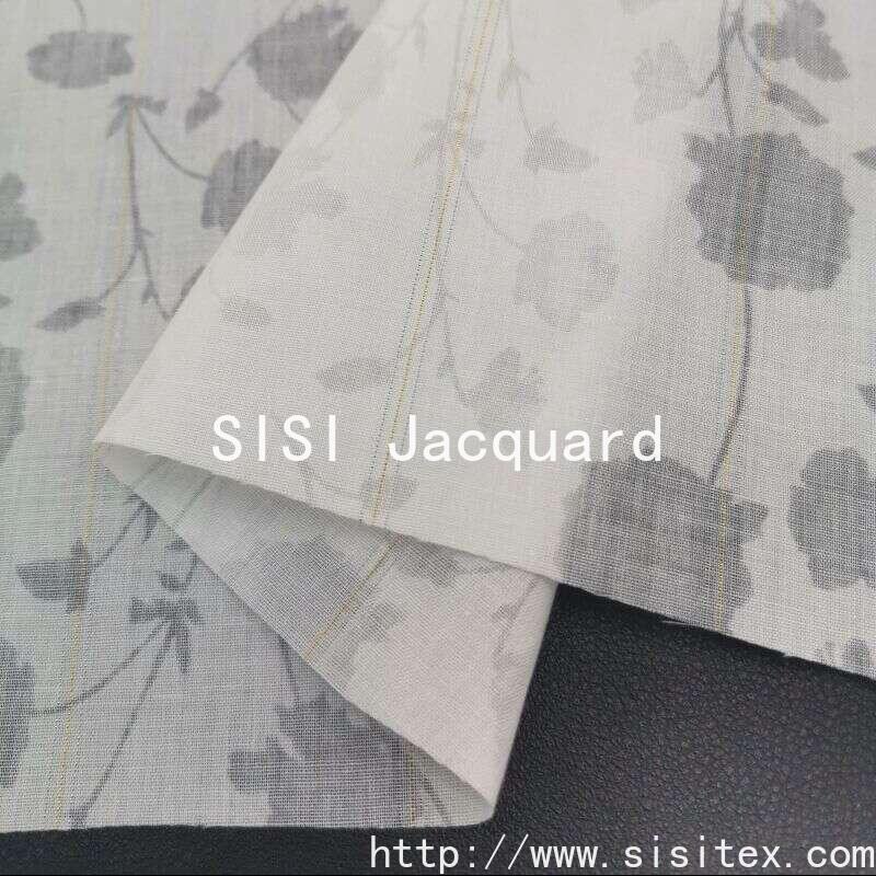 This "threaded jacquard" CVC gold and silver thread embroidered and printed fabric is based on an innovative 55% cotton and 45% polyester blend (CVC45CVC45). It is woven with a 9670 warp and weft density and incorporates a small amount of gold and silver threads (Lurex). The core feature of this fabric lies in the "embroidered" (burnt) technique, which removes local cotton fibers through chemical corrosion, leaving behind a translucent floral pattern composed of polyester and gold and silver threads. The width is 145 cm and the weight is only 78g/㎡. The fabric is lightweight and transparent. On a pure white base, it presents exquisite hollowed-out flowers and scattered sparkling gold and silver threads, creating a pure, romantic, and fresh and dreamy visual effect like snowflakes, perfectly aligning with the "minimalist and fresh" aesthetic.