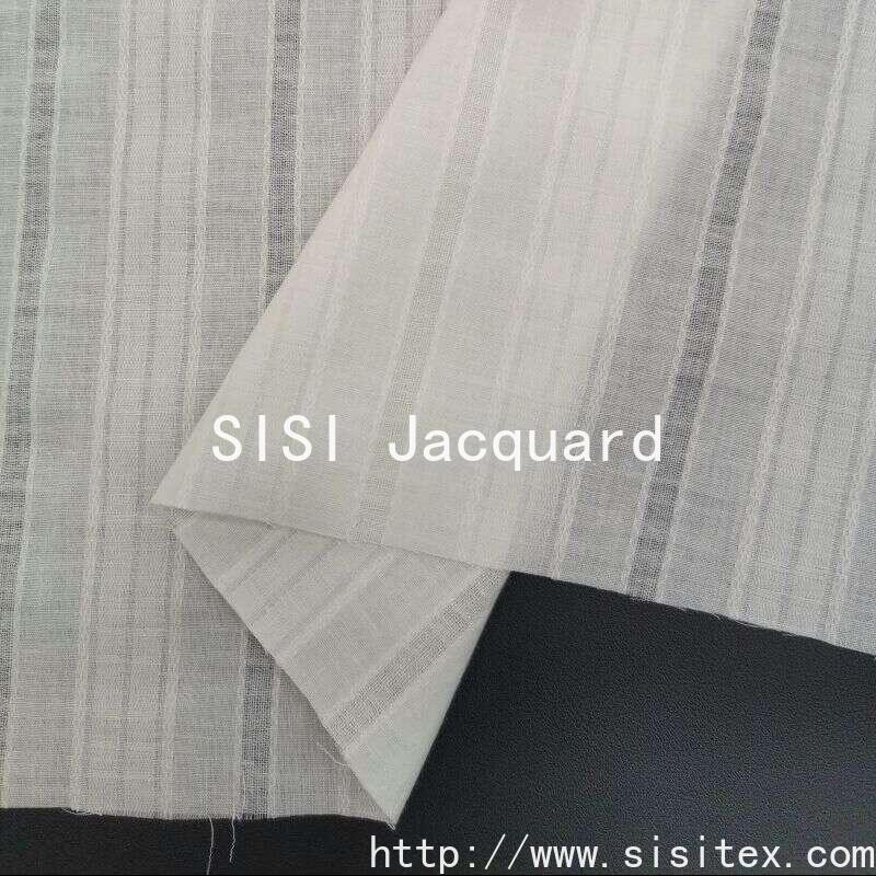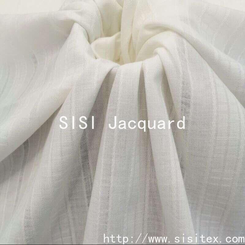 This "thread-by-thread jacquard" all-cotton muslin mesh jacquard fabric is made of 100% pure cotton yarn. It is匠心crafted with a yarn count of 40*40 and a weft and warp density of 95*66. The width is 145cm and the weight is 90g/㎡. It utilizes the classic muslin weave structure to create a natural and transparent longitudinal mesh pattern effect, and incorporates exquisite geometric jacquard patterns. The fabric is overall lightweight and flexible, and the pure white color adds a fresh and pure touch. The interplay of the mesh stripes and the geometric patterns alternate in texture, creating a visual effect with rhythm and breathing sensation. It perfectly combines the natural comfort of cotton with the fresh aesthetics of Japanese and Korean fashion.