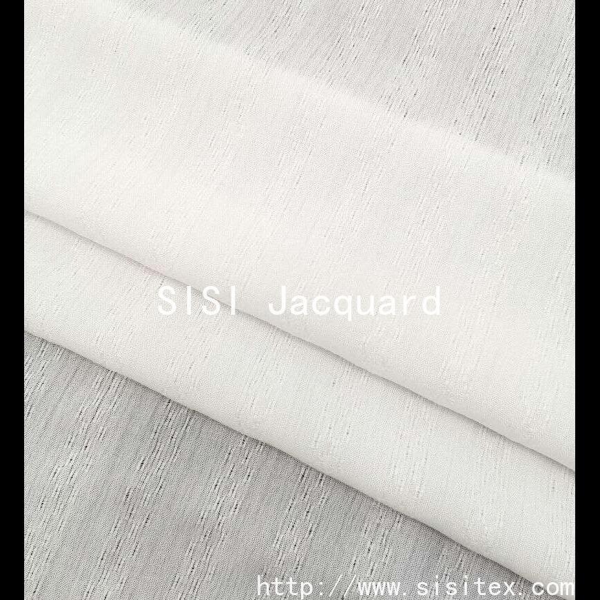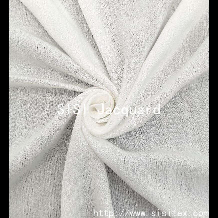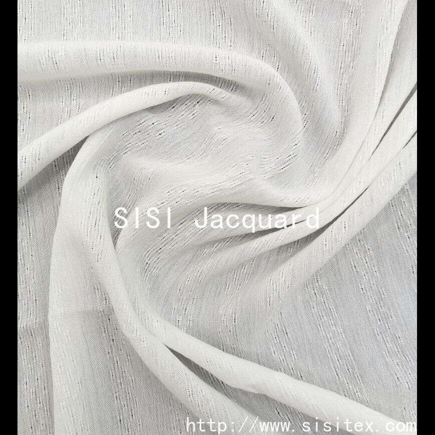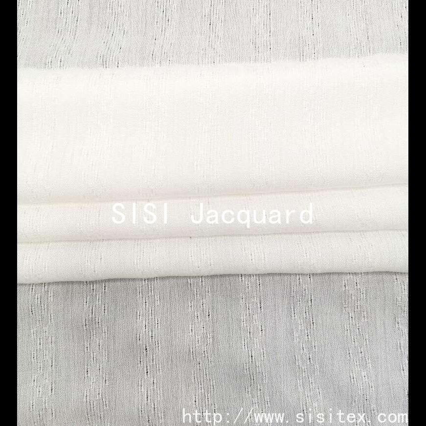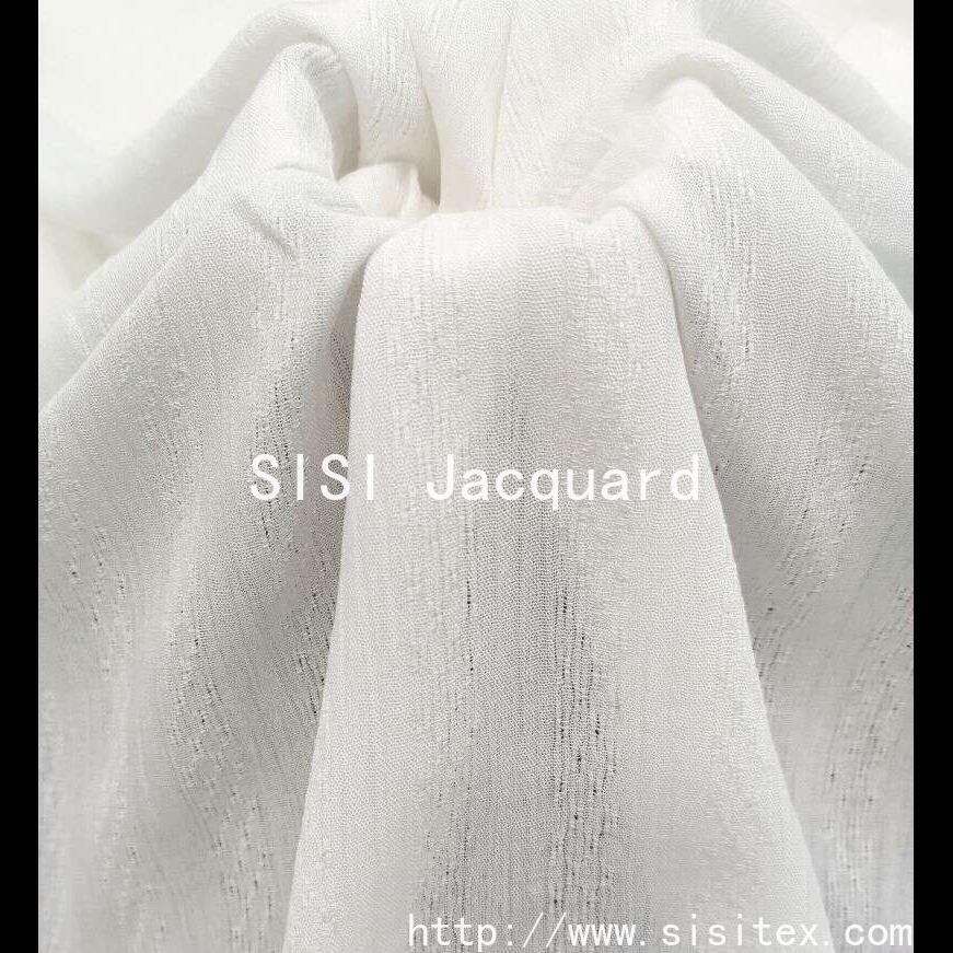This "thread-by-thread jacquard" cotton crepe fabric with geometric jacquard pattern is made of 100% cotton (Rayon). It is woven with a yarn count of R30 + R24 and a warp and weft density of 78*52. The width is 130CM and the weight is 118g/㎡. The texture is soft and drapes well, presenting the unique delicate crepe texture and natural texture of cotton crepe fabric on the surface, along with clear and three-dimensional geometric jacquard patterns. The fabric has a smooth and skin-friendly touch, good moisture absorption and breathability, as well as excellent drape and wrinkle resistance. The pure white base color highlights the exquisite outline of the geometric patterns. The overall style is simple yet has a retro charm. It is a special fabric that combines a comfortable experience with design aesthetics.