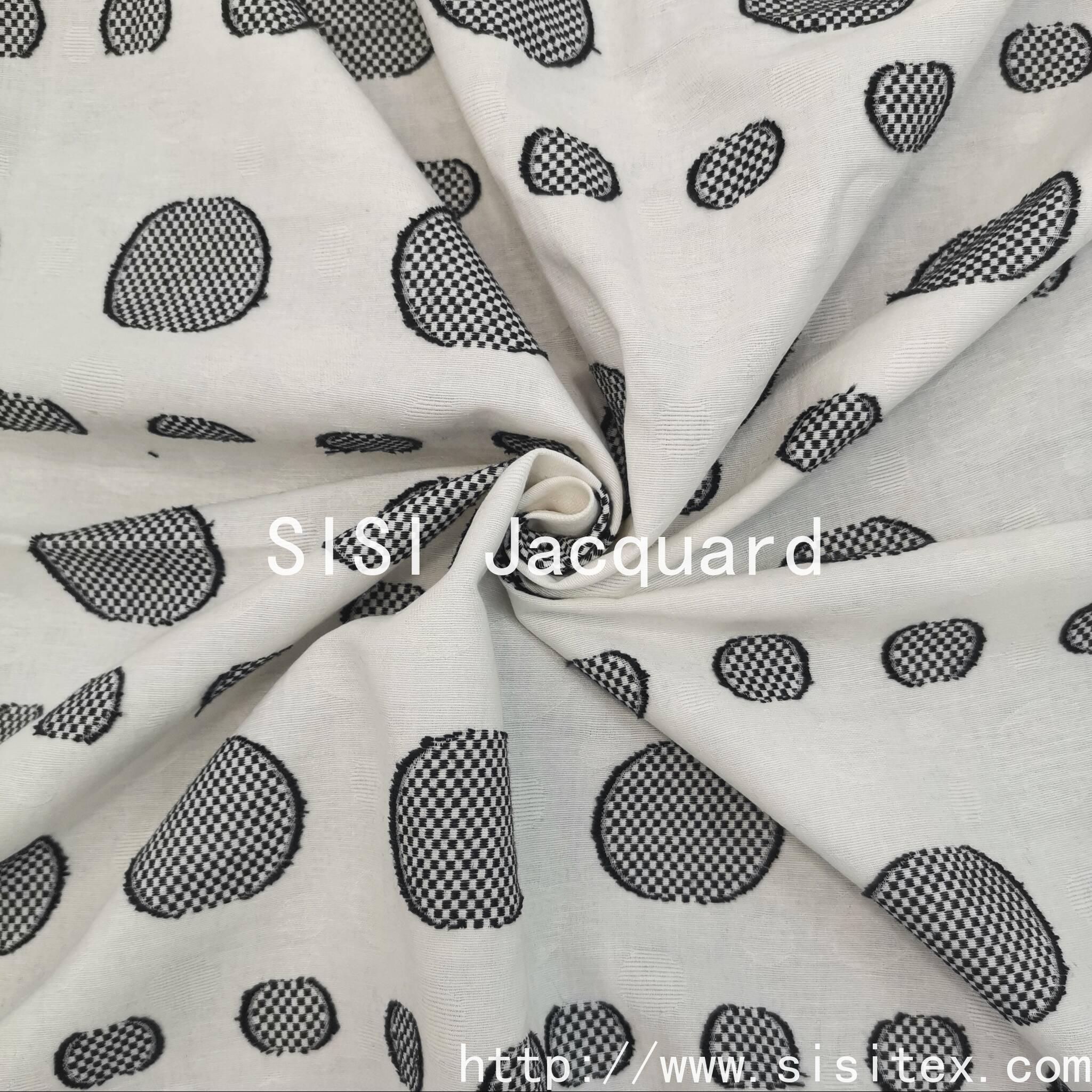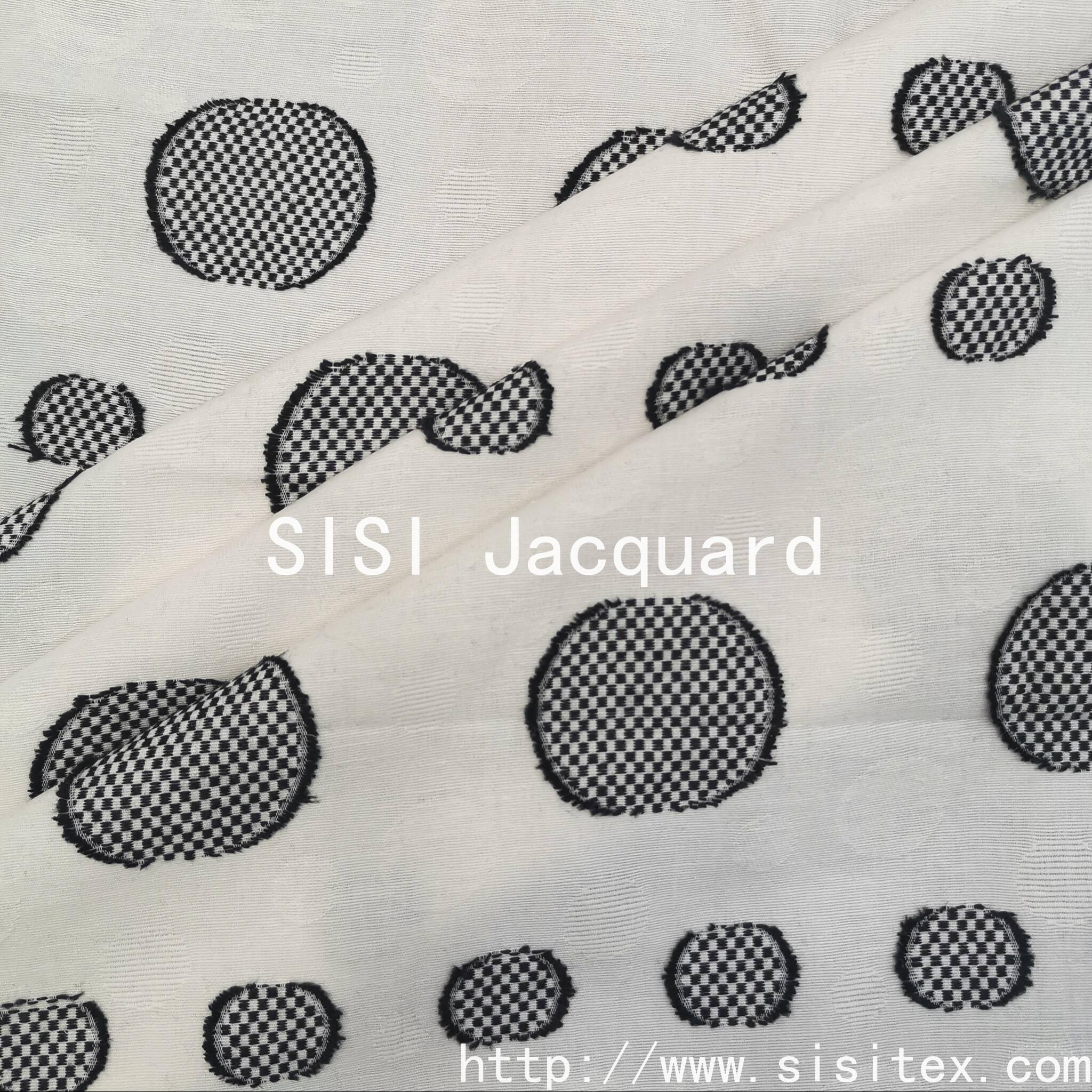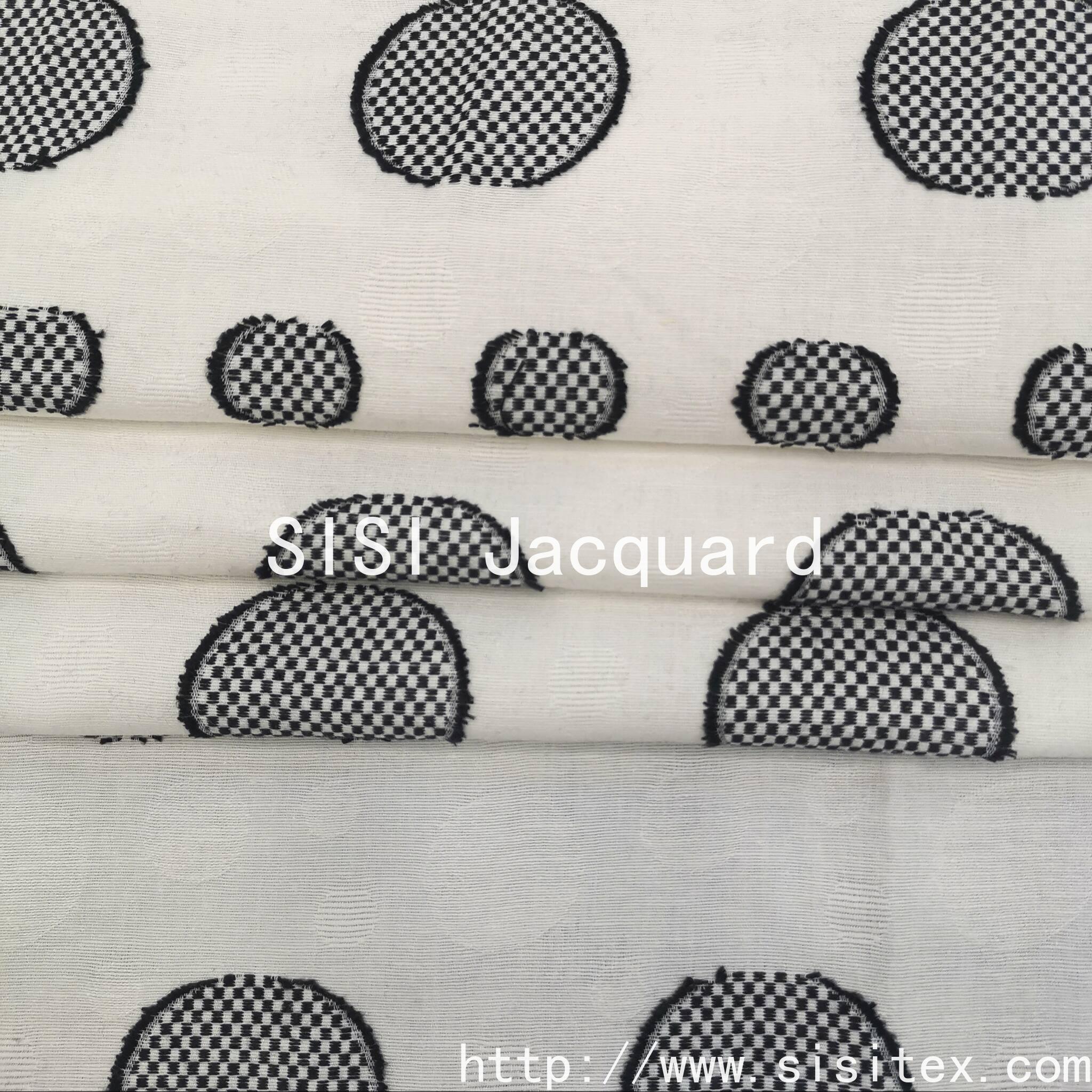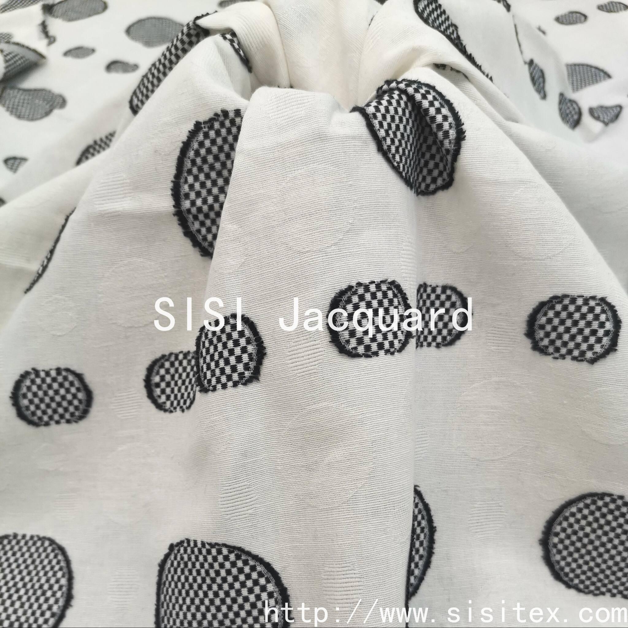 SIS woven blended jacquard cutting fabric, selected 73% cotton, 11% polyester, 16% hemp natural blend material, combined with woven technology and three-dimensional jacquard cutting design, to create a distinct layer of "big and small circle" texture. The soft and breathable cotton, the natural crisp of hemp and the wear-resistant and anti-wrinkle of polyester are perfectly integrated, which not only retains the natural texture, but also improves the practical performance, giving the fabric unique artistic expression and functionality.