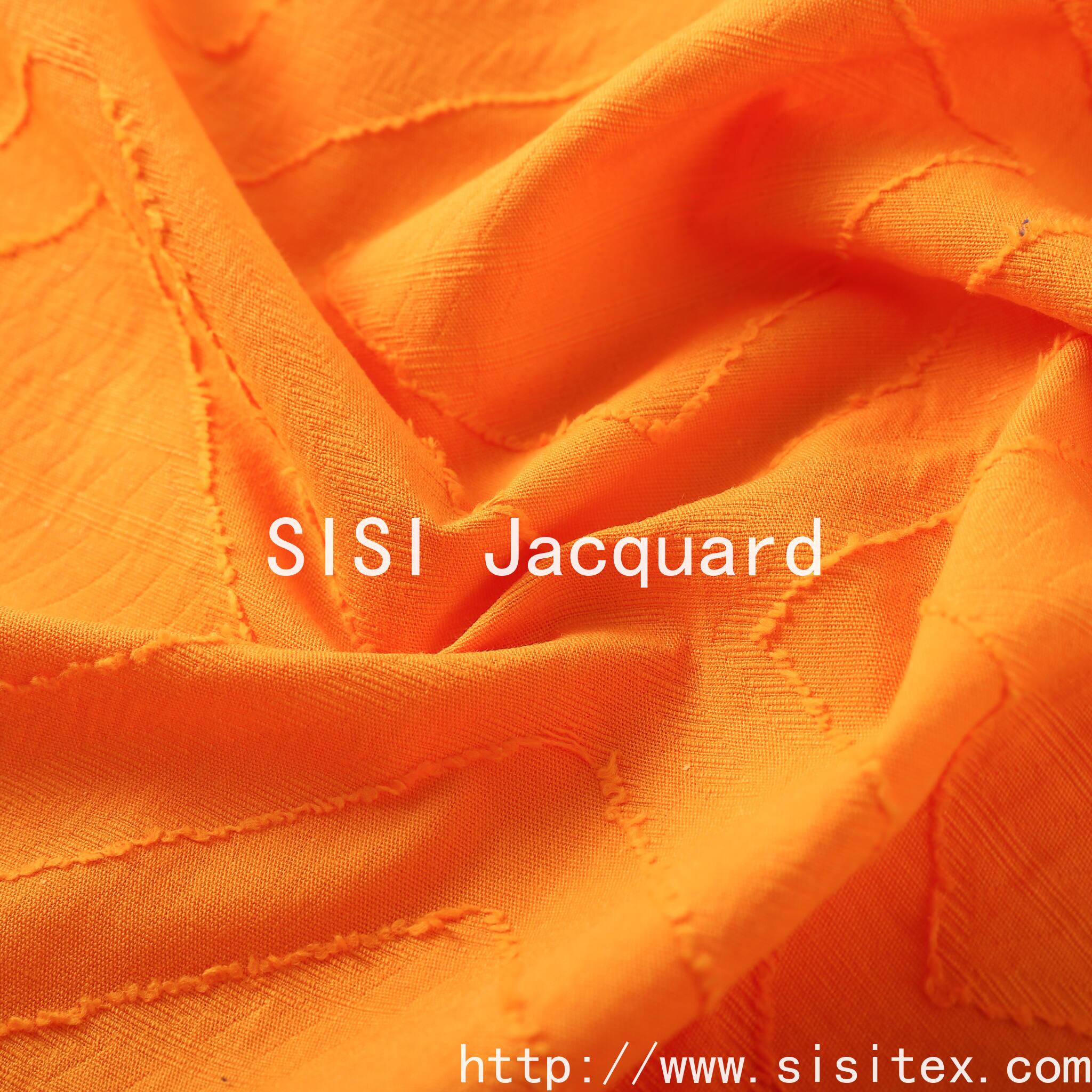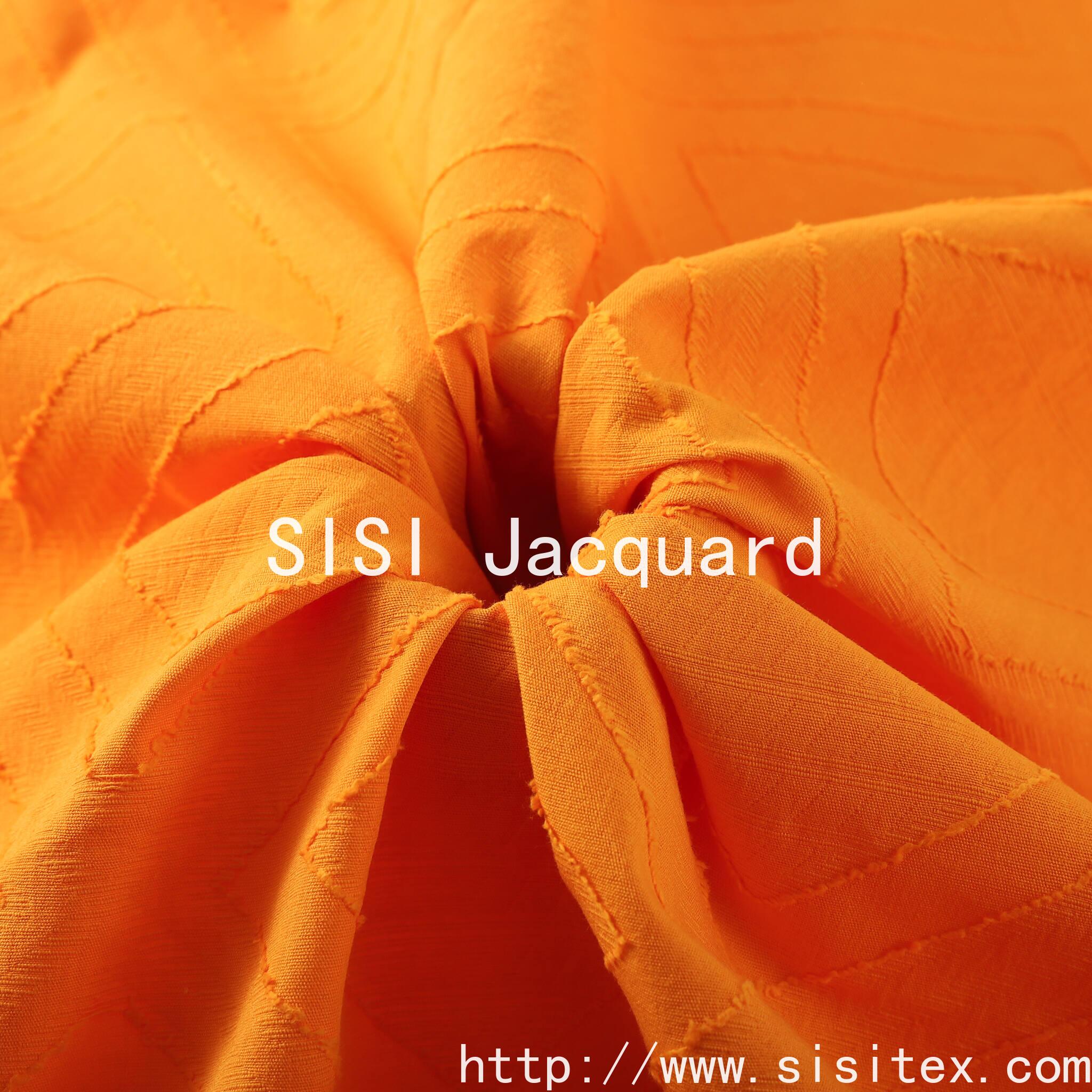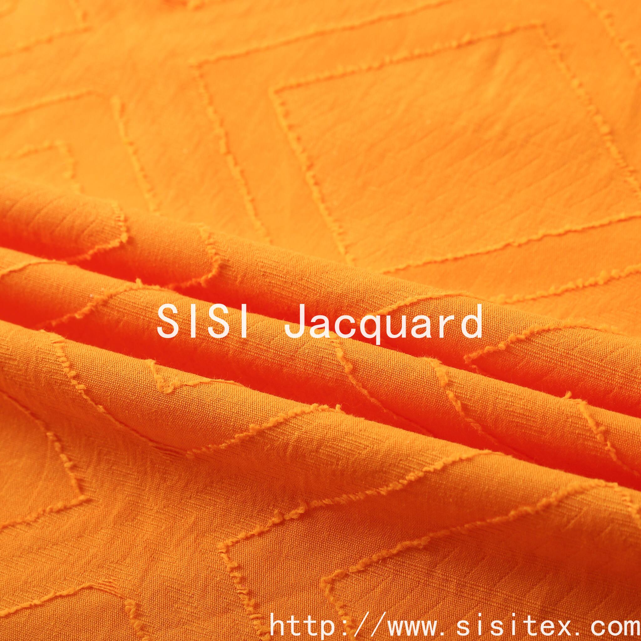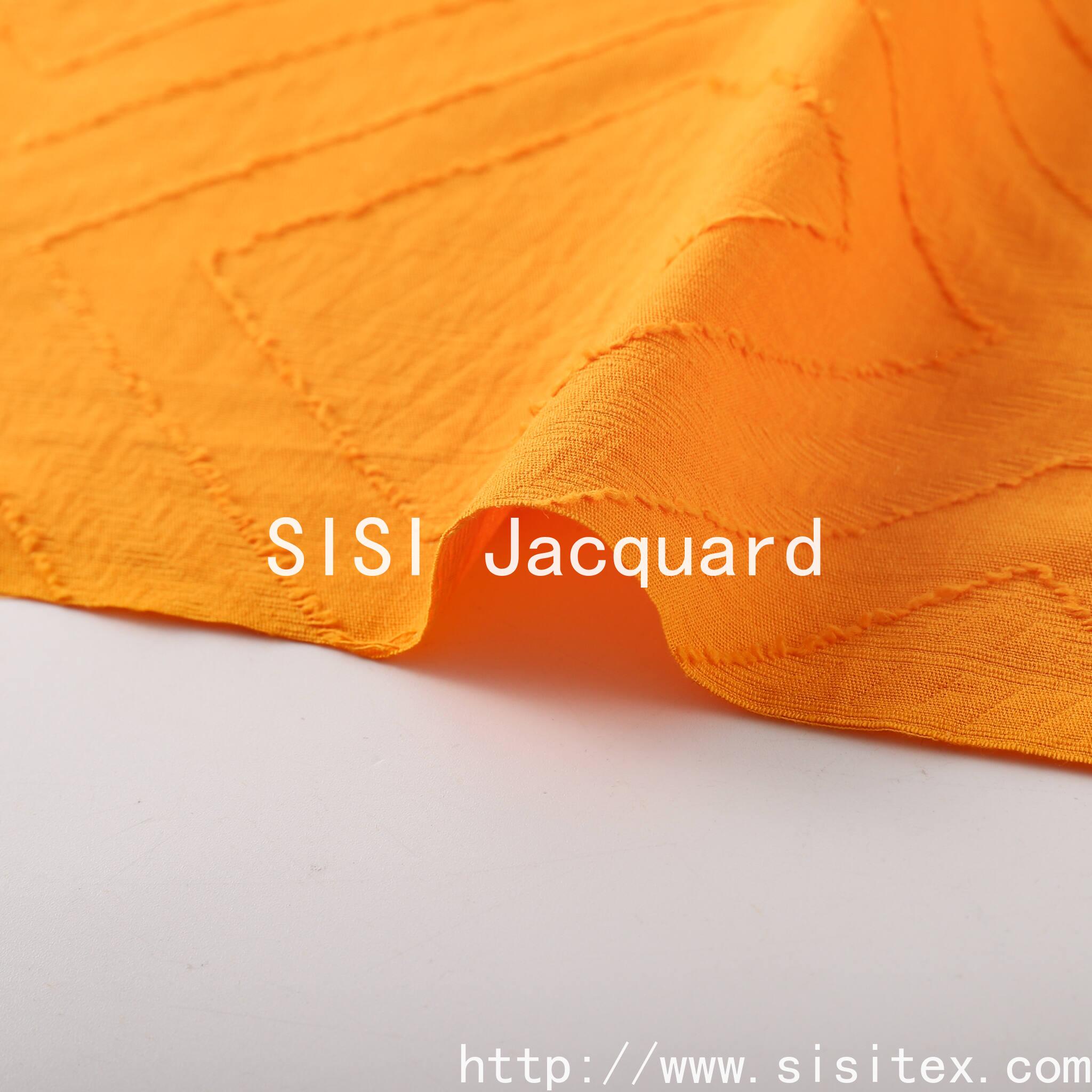 "SISI Silk Jacquard" launched a new cotton large jacquard diamond cut fabric, 100% natural cotton as the base, the fabric combines classic jacquard technology and innovative diamond cut design, showing a unique three-dimensional texture and exquisite geometric beauty. Bright orange tone with delicate three-dimensional jacquard, the edge of the natural raw edge to add handmade texture, both artistic and practical, is the pursuit of quality and design sense of the ideal choice.