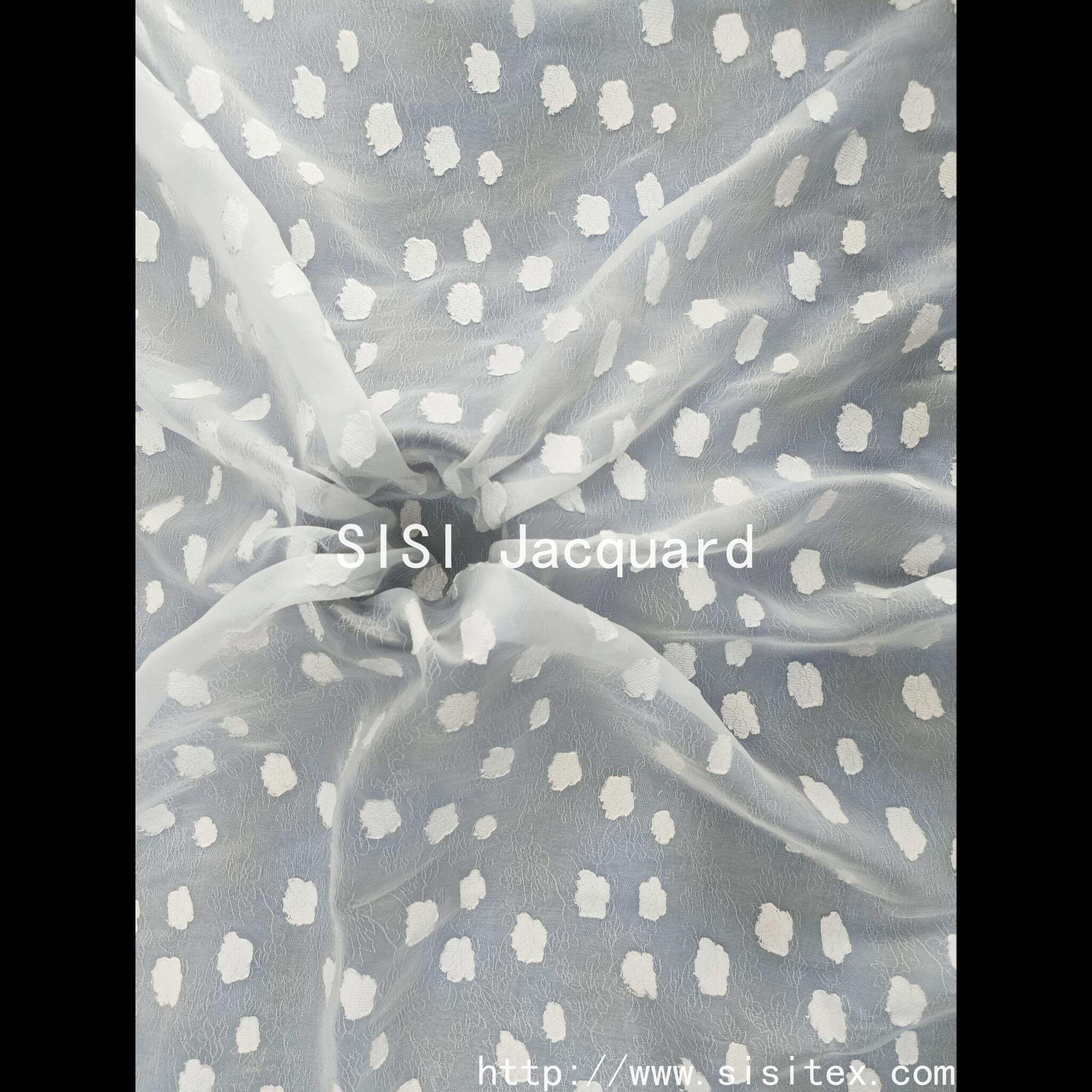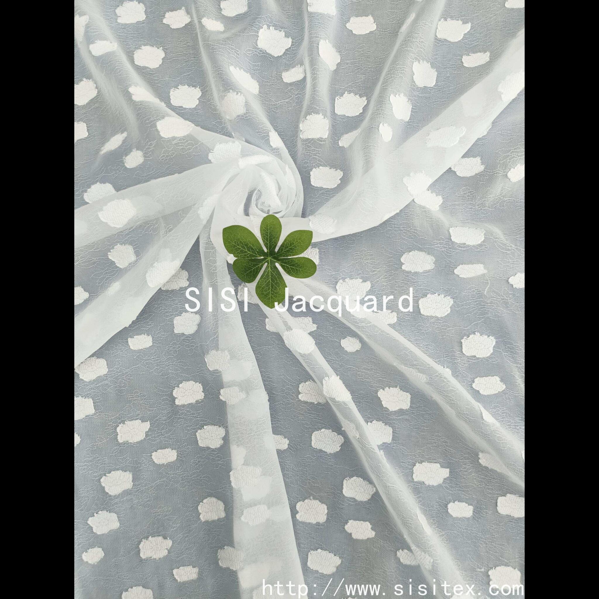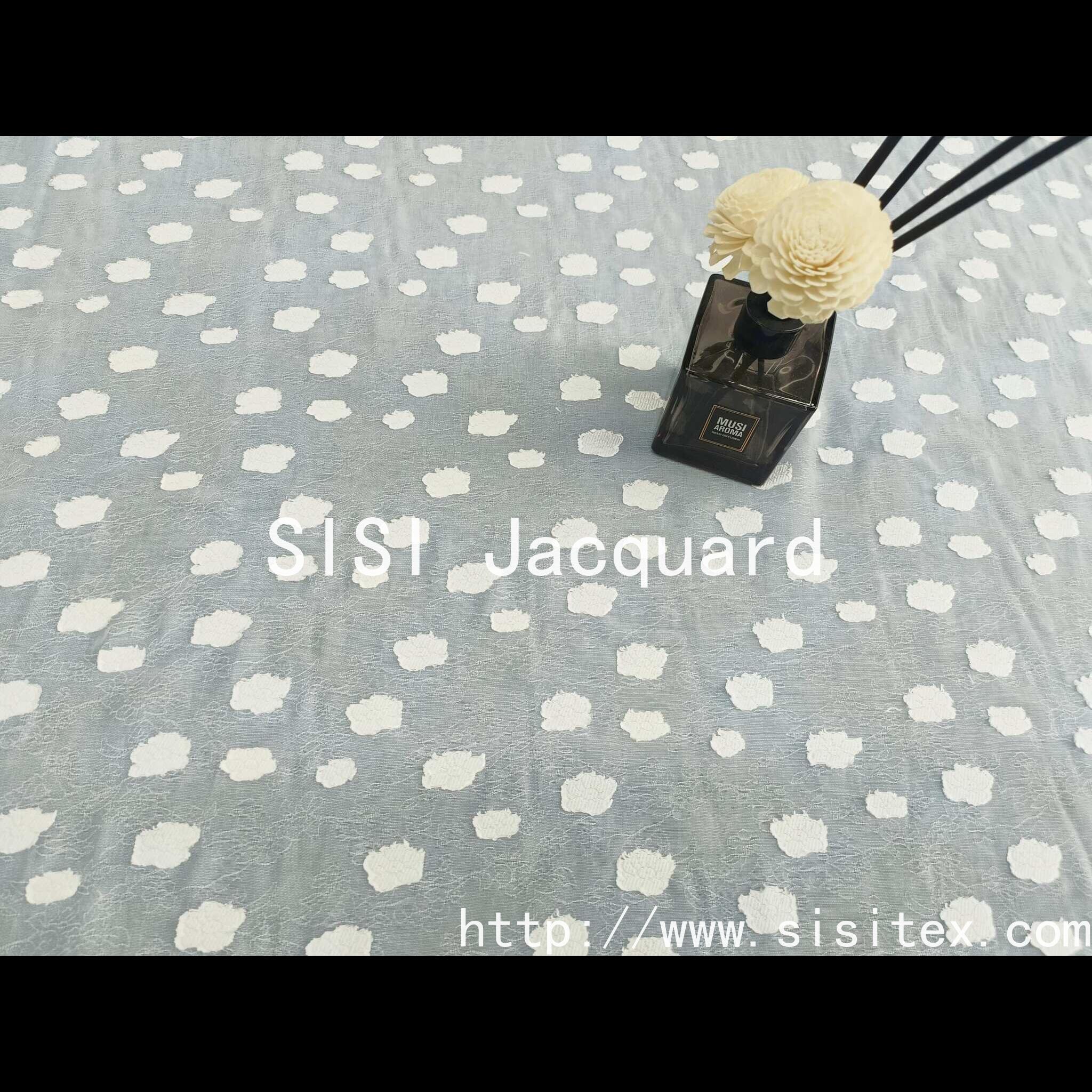 This product is made of nylon + viscose blended glass yarn **, combined with ** flower jacquard ** and ** circle cutting process **, to create a light as feathers, light as fog unique texture. The surface of the fabric is mainly visualized by flower-like jacquard lines, supplemented by hollow circles and cut flowers, forming a three-dimensional level of virtual and real interleaving. The smooth luster of the glass yarn and the moisture absorption of the viscose complement each other, and the touch is cool and silky, perfect for spring and summer light wear and high-end home design.