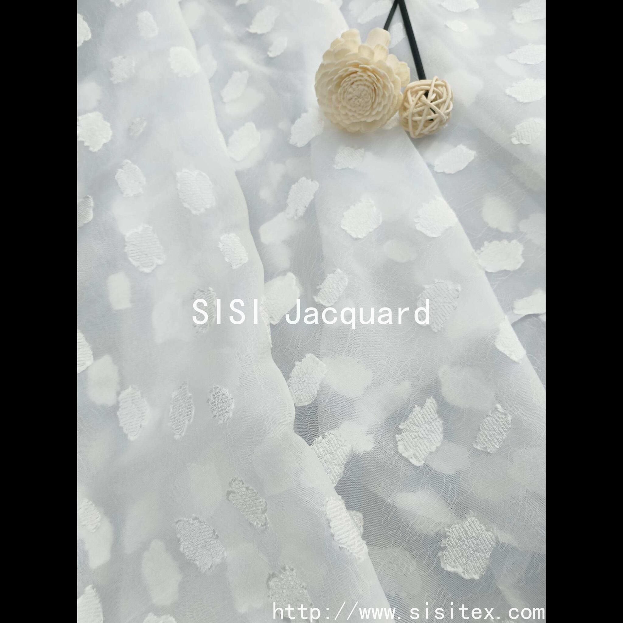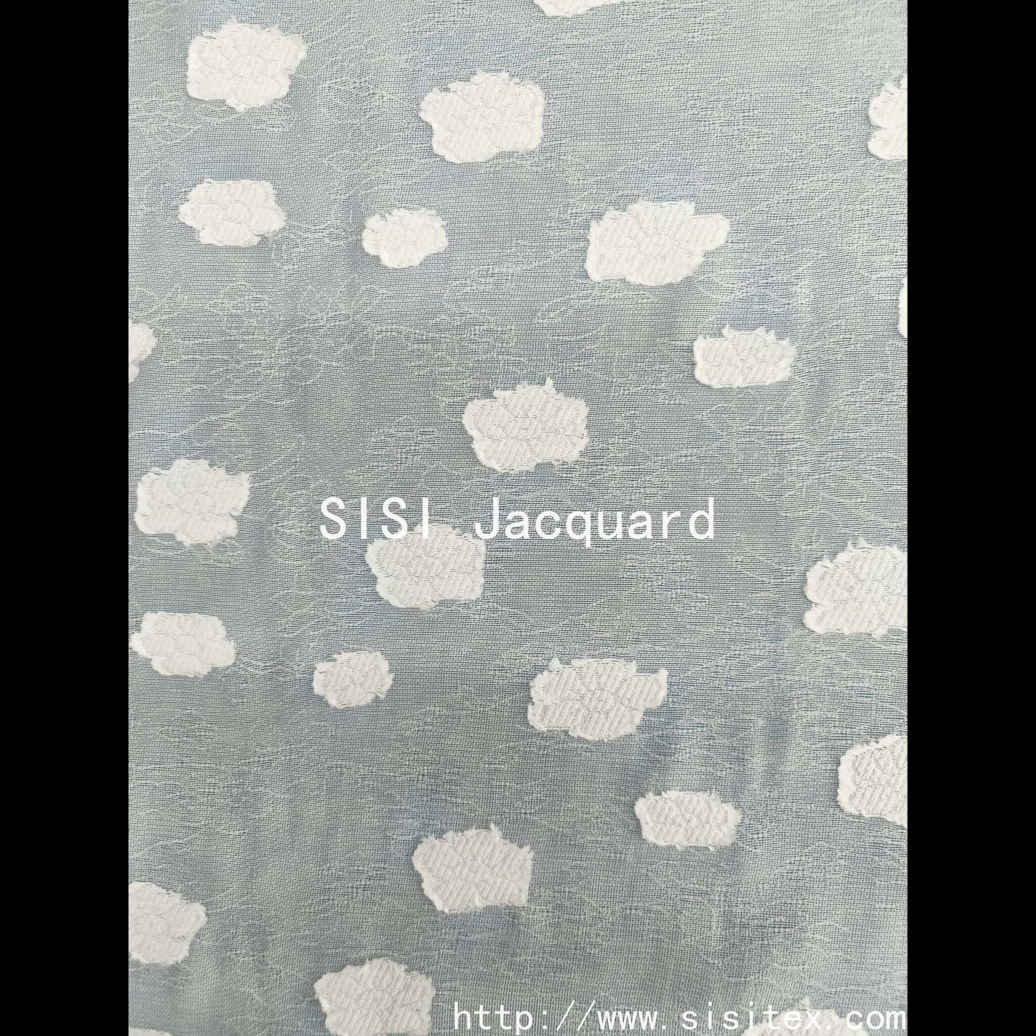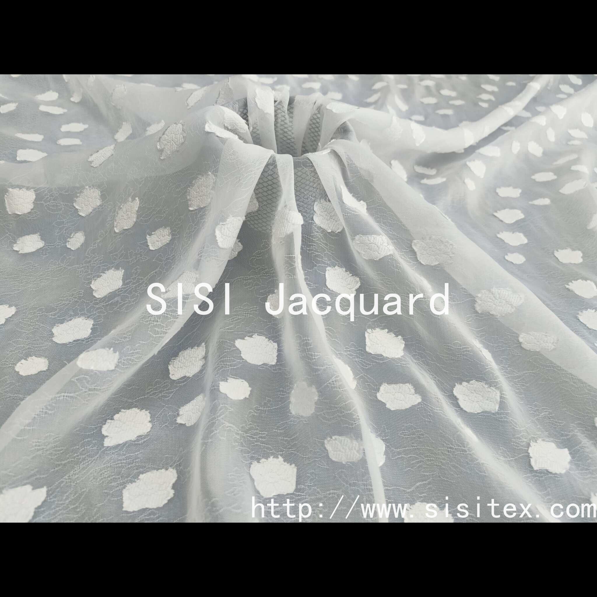 This product is made of nylon + viscose blended glass yarn **, combined with ** flower jacquard ** and ** circle cutting process **, to create a light as feathers, light as fog unique texture. The surface of the fabric is mainly visualized by flower-like jacquard lines, supplemented by hollow circles and cut flowers, forming a three-dimensional level of virtual and real interleaving. The smooth luster of the glass yarn and the moisture absorption of the viscose complement each other, and the touch is cool and silky, perfect for spring and summer light wear and high-end home design.