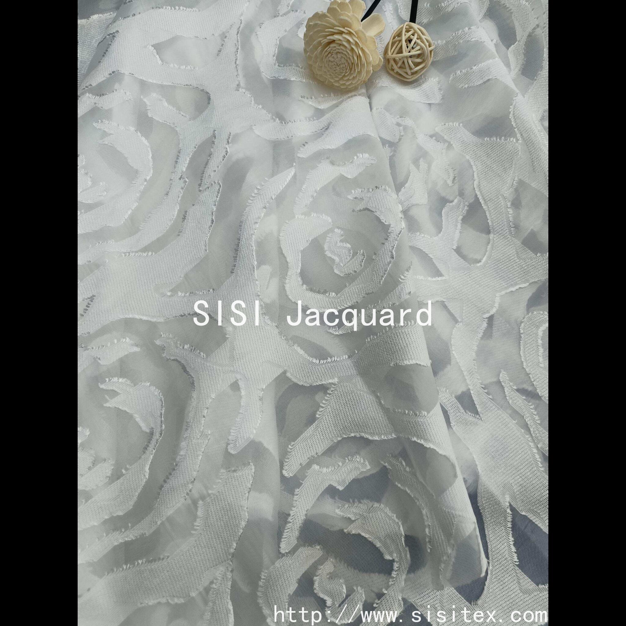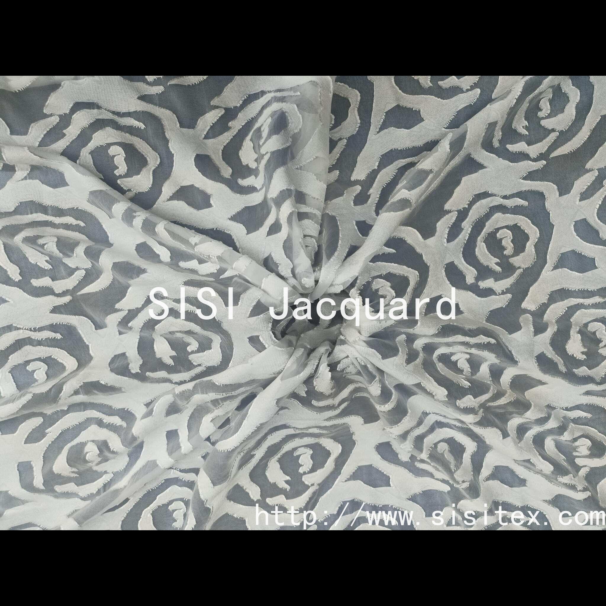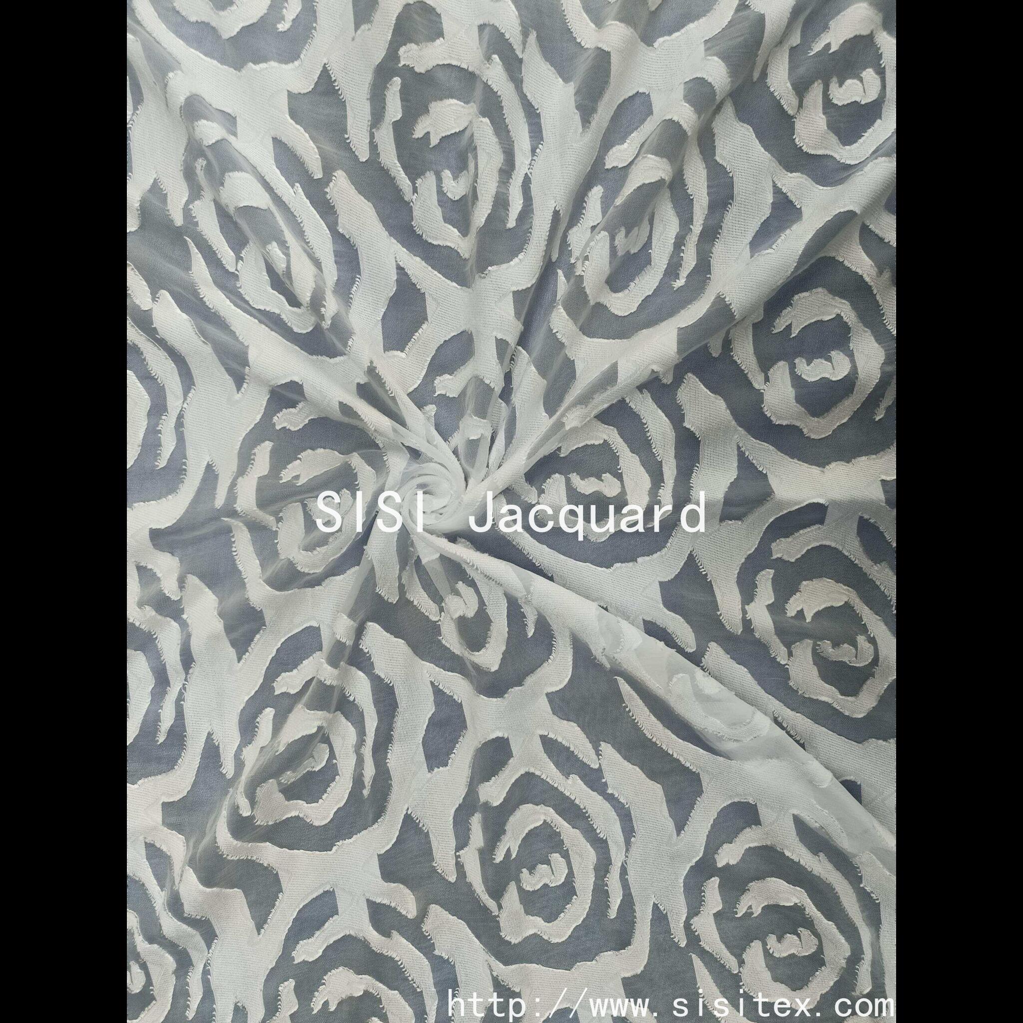 This product is made of nylon + viscose blended transparent organse yarn **, through precision jacquard technology ** and ** laser cutting technology **, the classic rose pattern is presented in the form of three-dimensional hollow. The fabric is thin as cicada wings but flexible and shaped, the light transmission is micro, the touch is smooth and cool, the rose branches are scattered and interwoven, and the romantic atmosphere is fully shown between the virtual and solid light and shadow. The crisp sense of organze and the cut flower transparent design are perfectly balanced, suitable for the custom dress, wedding veil and art home scene, giving the work a dual charm of elegance and agility.