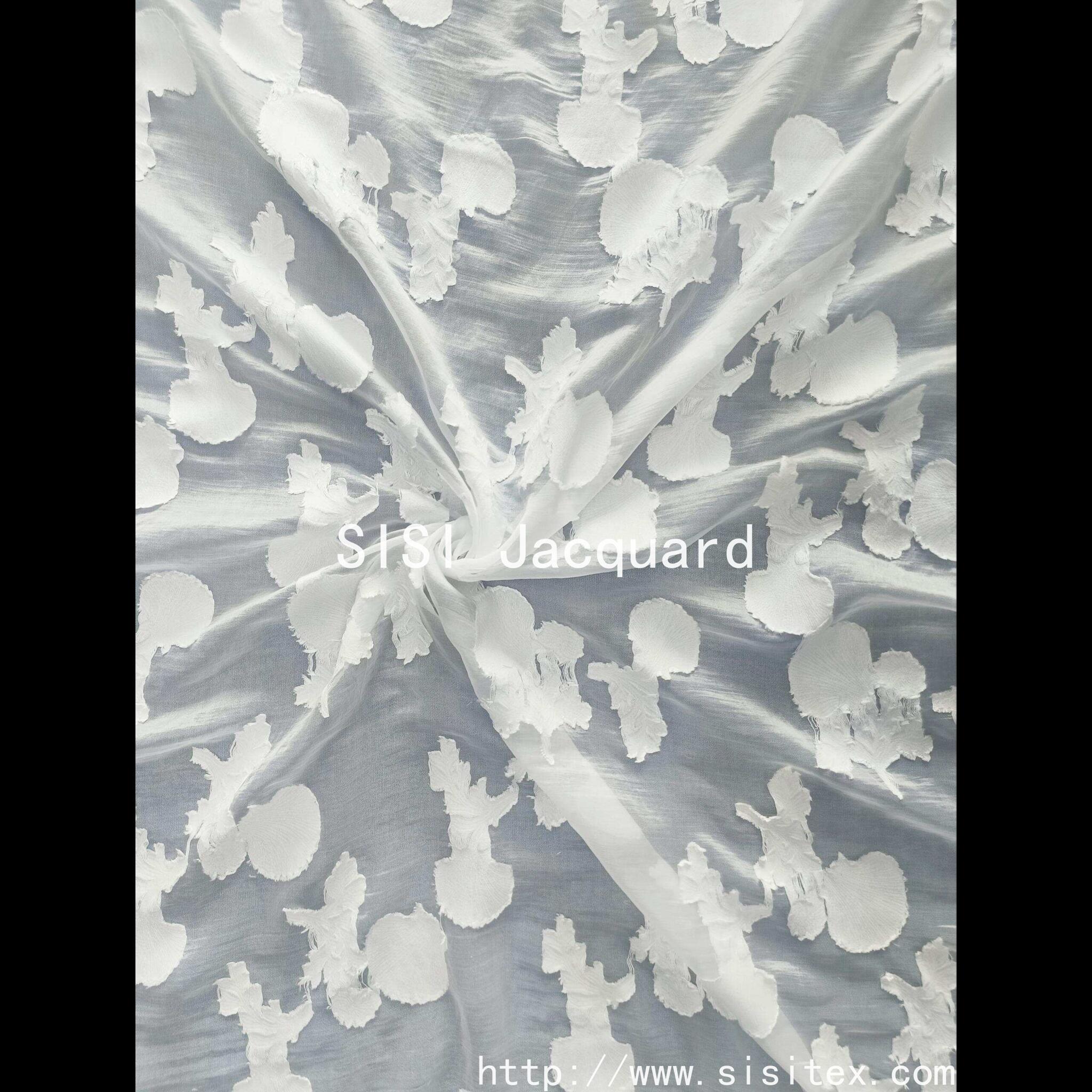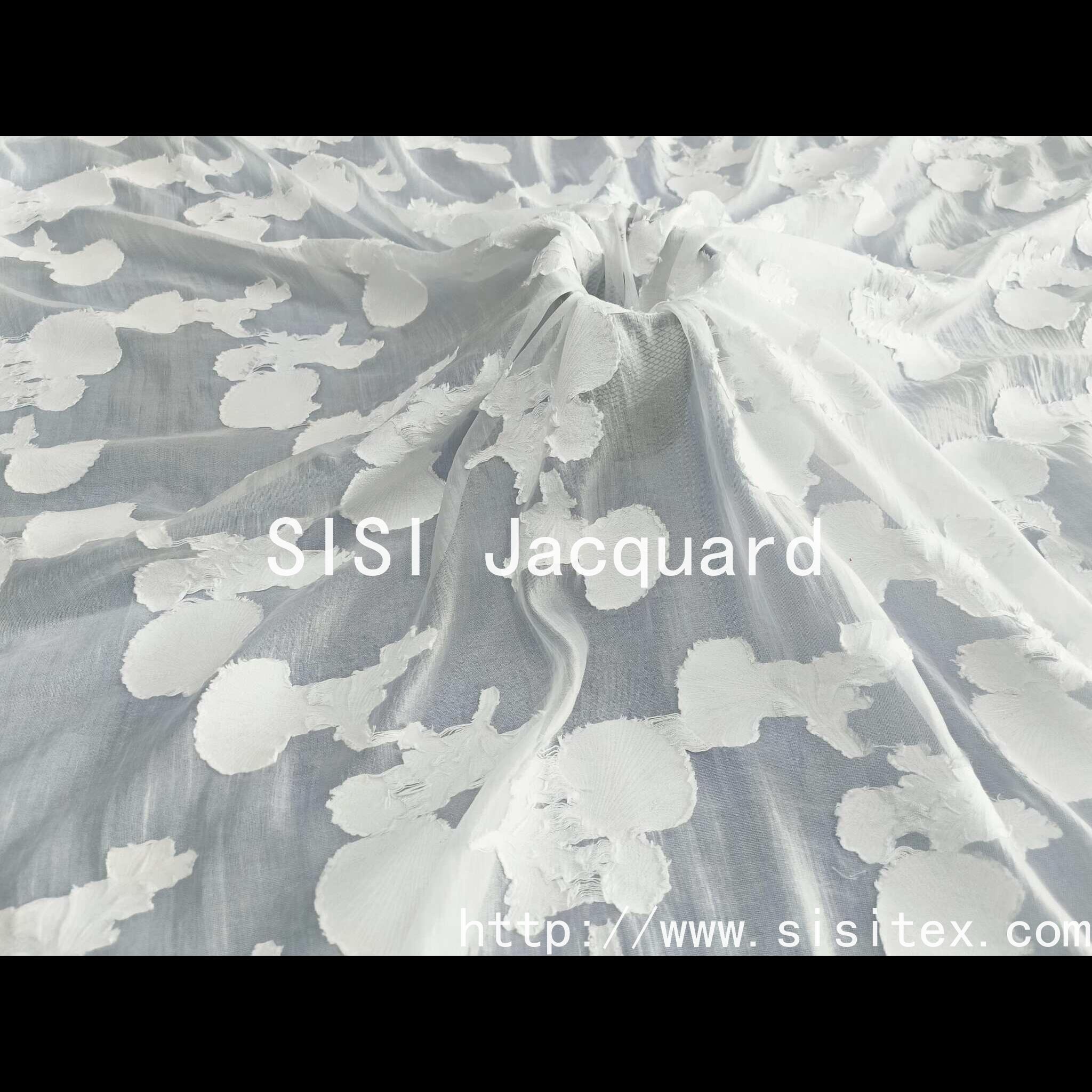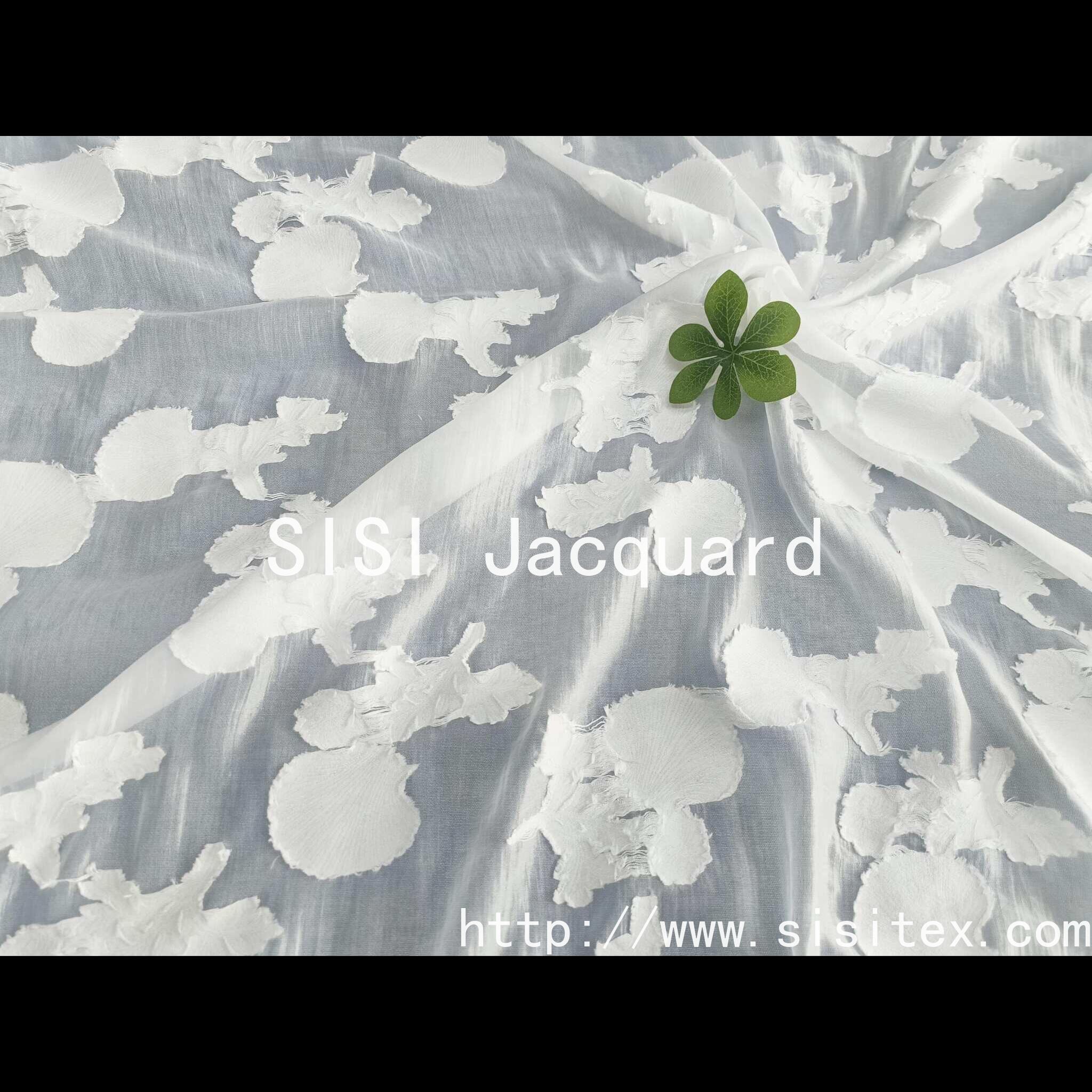 This product is based on **40% polynylon +20% viscose blended transparent yarn **. Through precision ** scallop jacquard process **, the Marine elements are condensed into three-dimensional ripple texture, creating a flowing aesthetic feeling like waves caressing the beach. The fabric is as thin as cicada wings but flexible and bone feeling, transparent, cool and silky to the touch, scallop jacquard scattered distribution, hidden under light and shadow, both artistic tension and practical wear, is the ideal choice for spring and summer couture, romantic wedding dress and creative design.