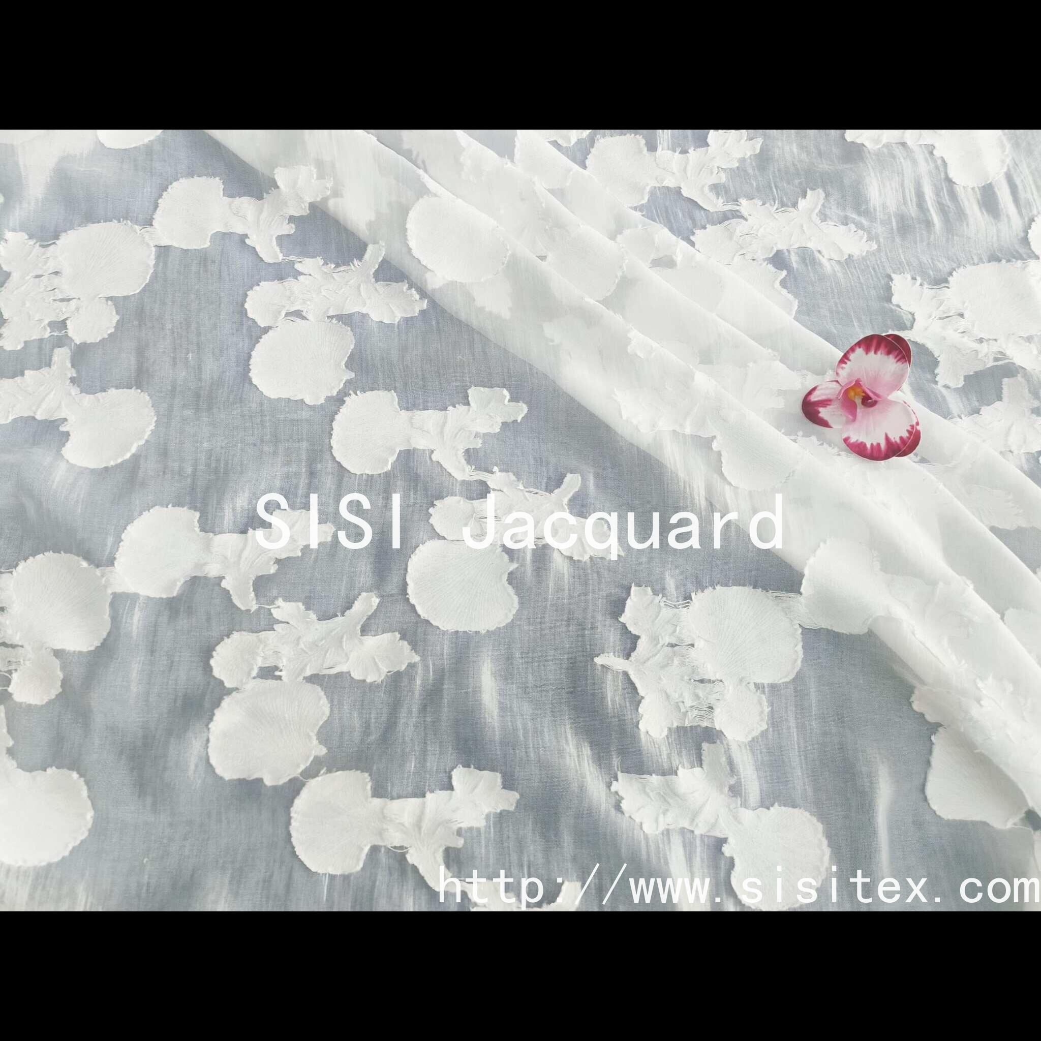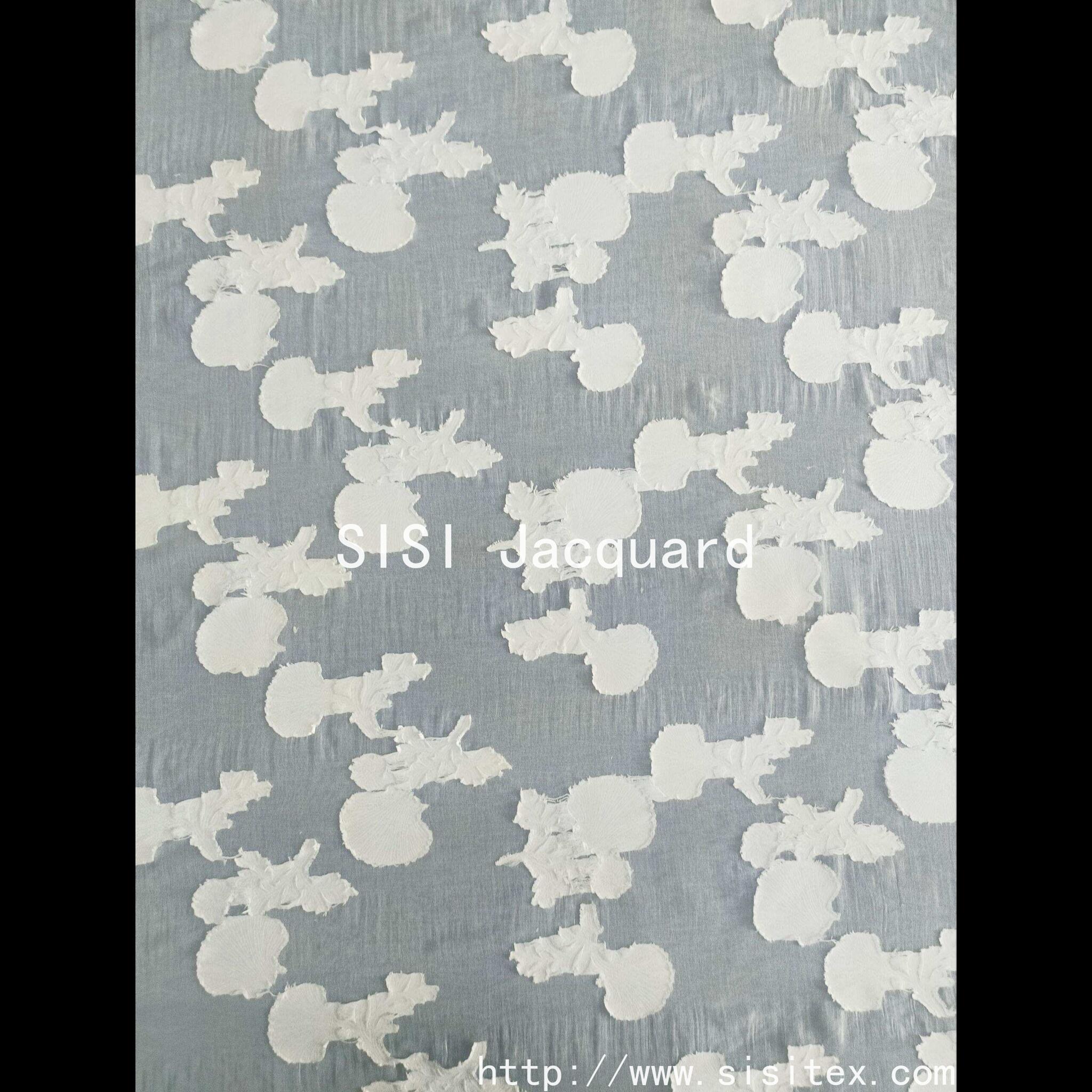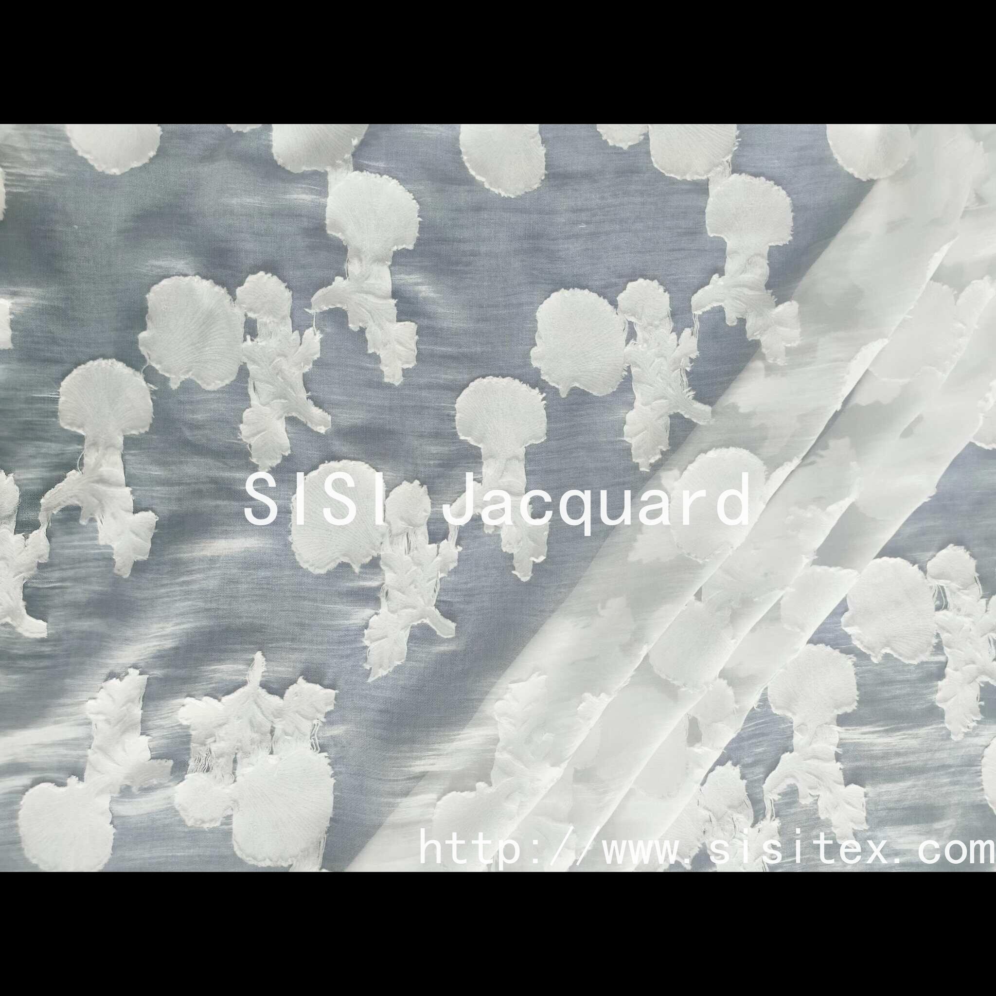 This product is based on **40% polynylon +20% viscose blended transparent yarn **. Through precision ** scallop jacquard process **, the Marine elements are condensed into three-dimensional ripple texture, creating a flowing aesthetic feeling like waves caressing the beach. The fabric is as thin as cicada wings but flexible and bone feeling, transparent, cool and silky to the touch, scallop jacquard scattered distribution, hidden under light and shadow, both artistic tension and practical wear, is the ideal choice for spring and summer couture, romantic wedding dress and creative design.