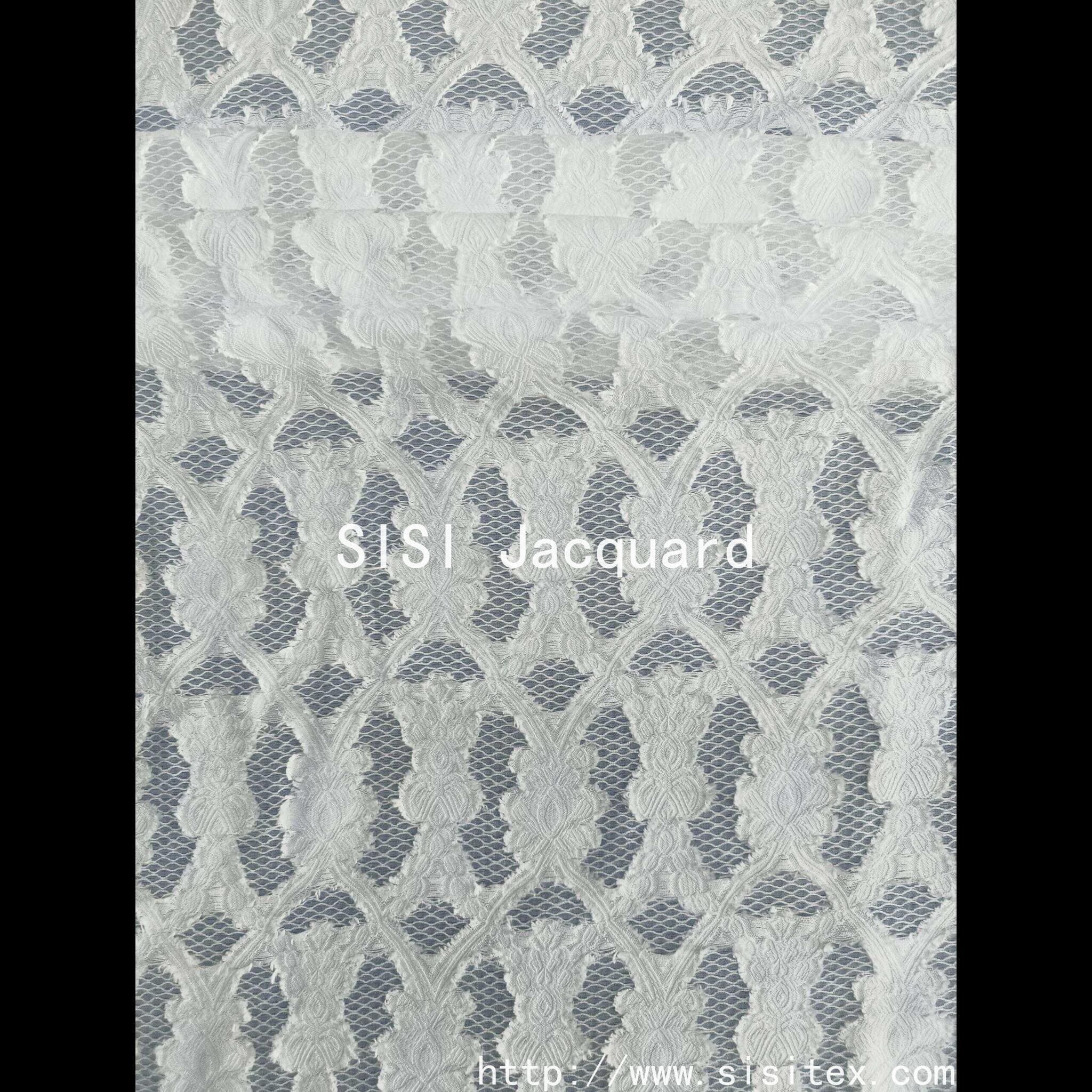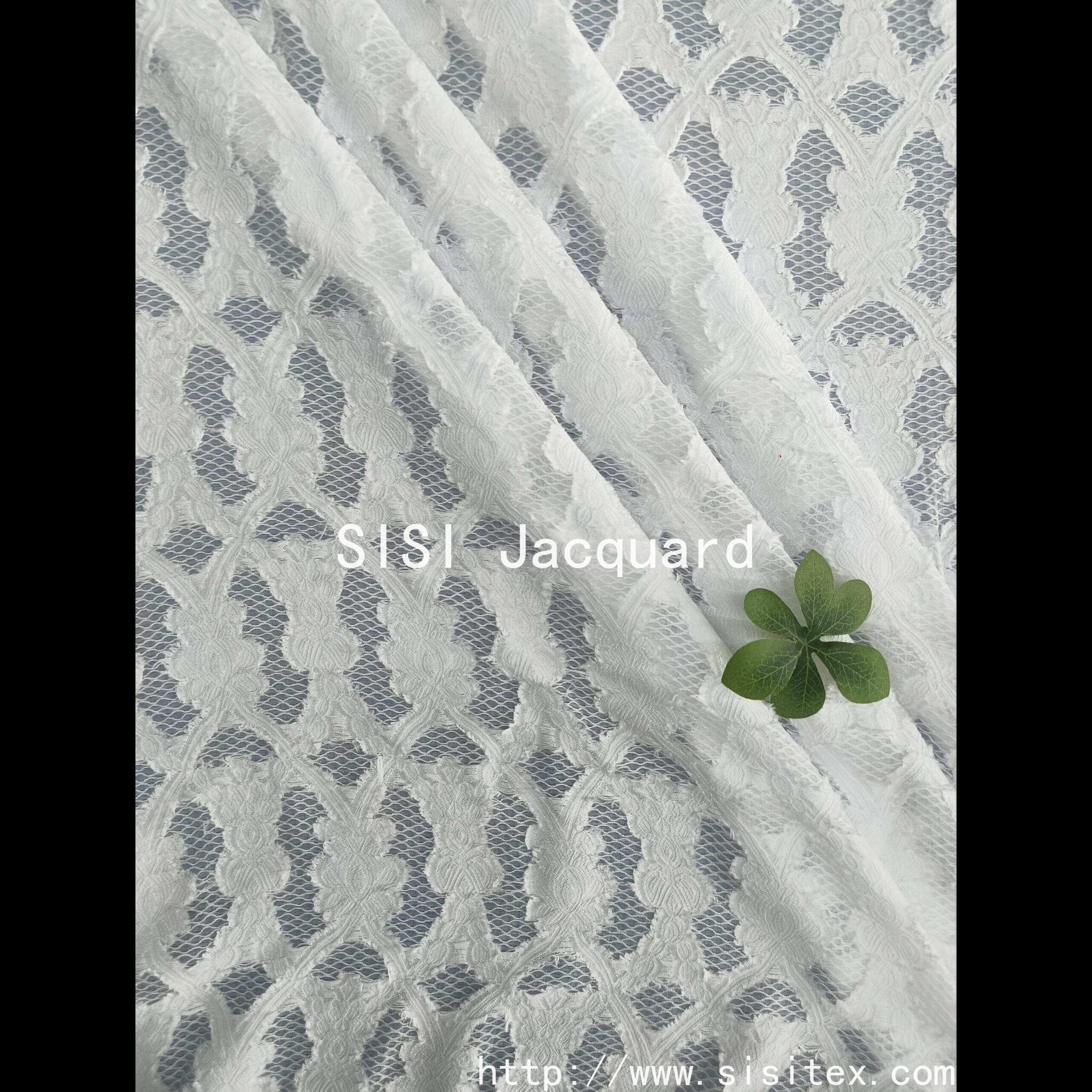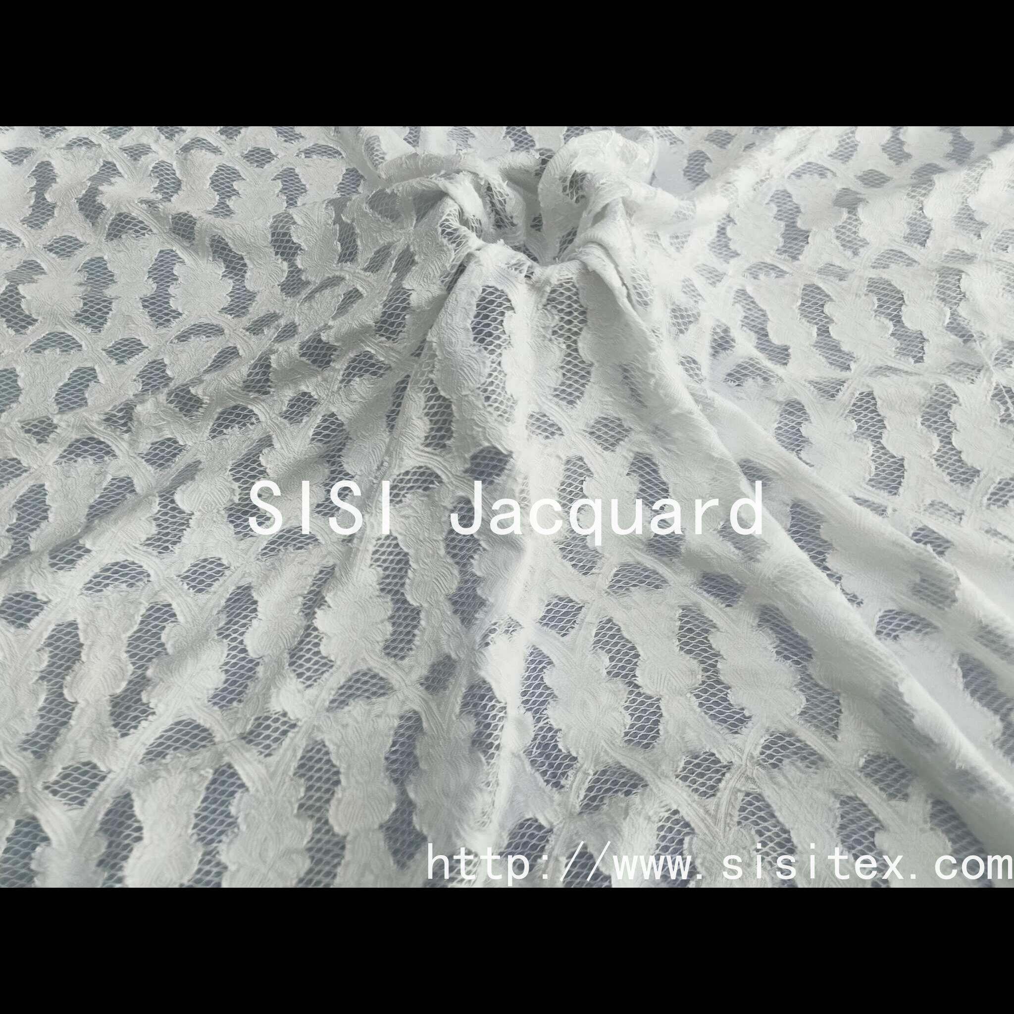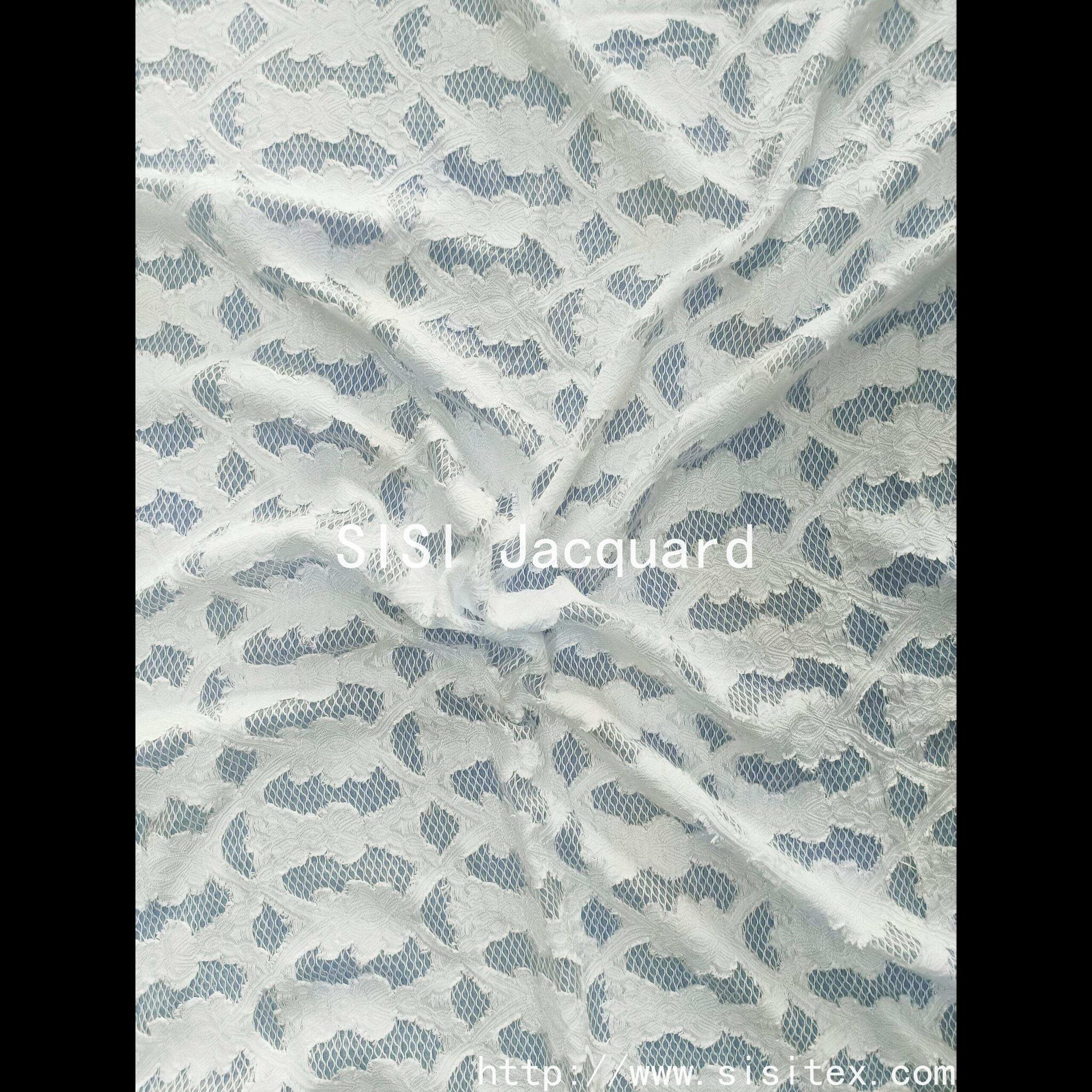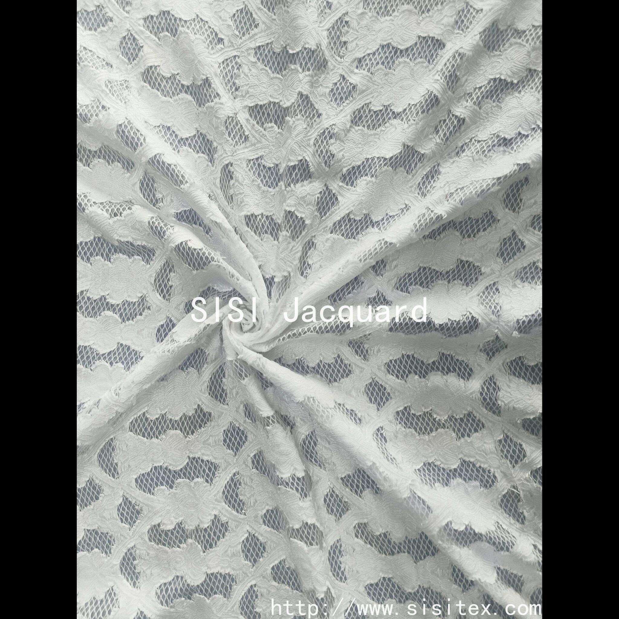 This product is made of ** nylon + viscose blended ** material, combined with ** hollow mesh jacquard technology ** and ** fishing lace design **, to create a fashion fabric with both permeability and structural beauty. The surface is mainly visual with delicate fish mesh jacquard, and the virtual and real contrast formed by hollow mesh creates a hazy aesthetic feeling. The material is flexible and light, the touch is silky and slightly cool, the glass-like luster and lace texture complement each other, perfect for couture fashion, wedding dresses and creative home design.