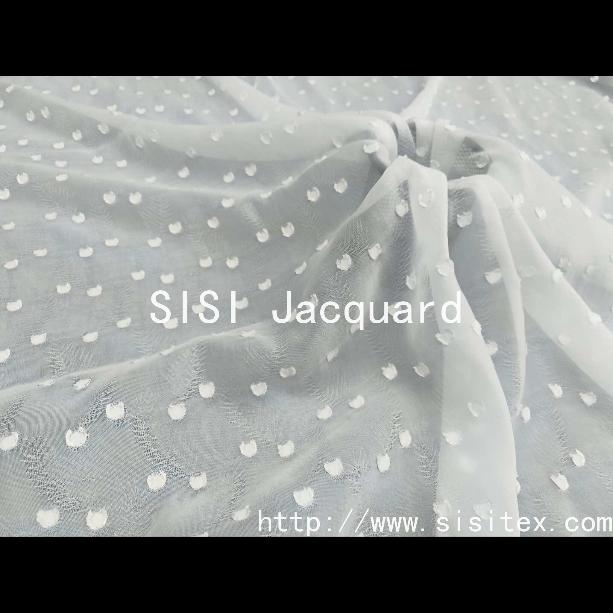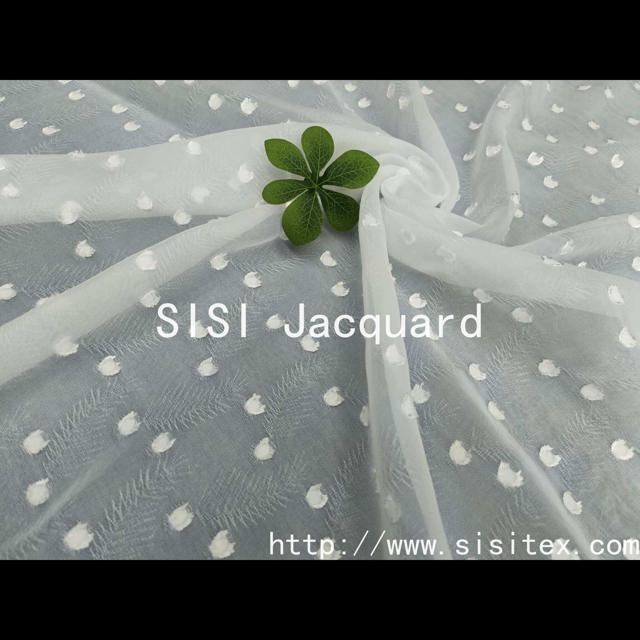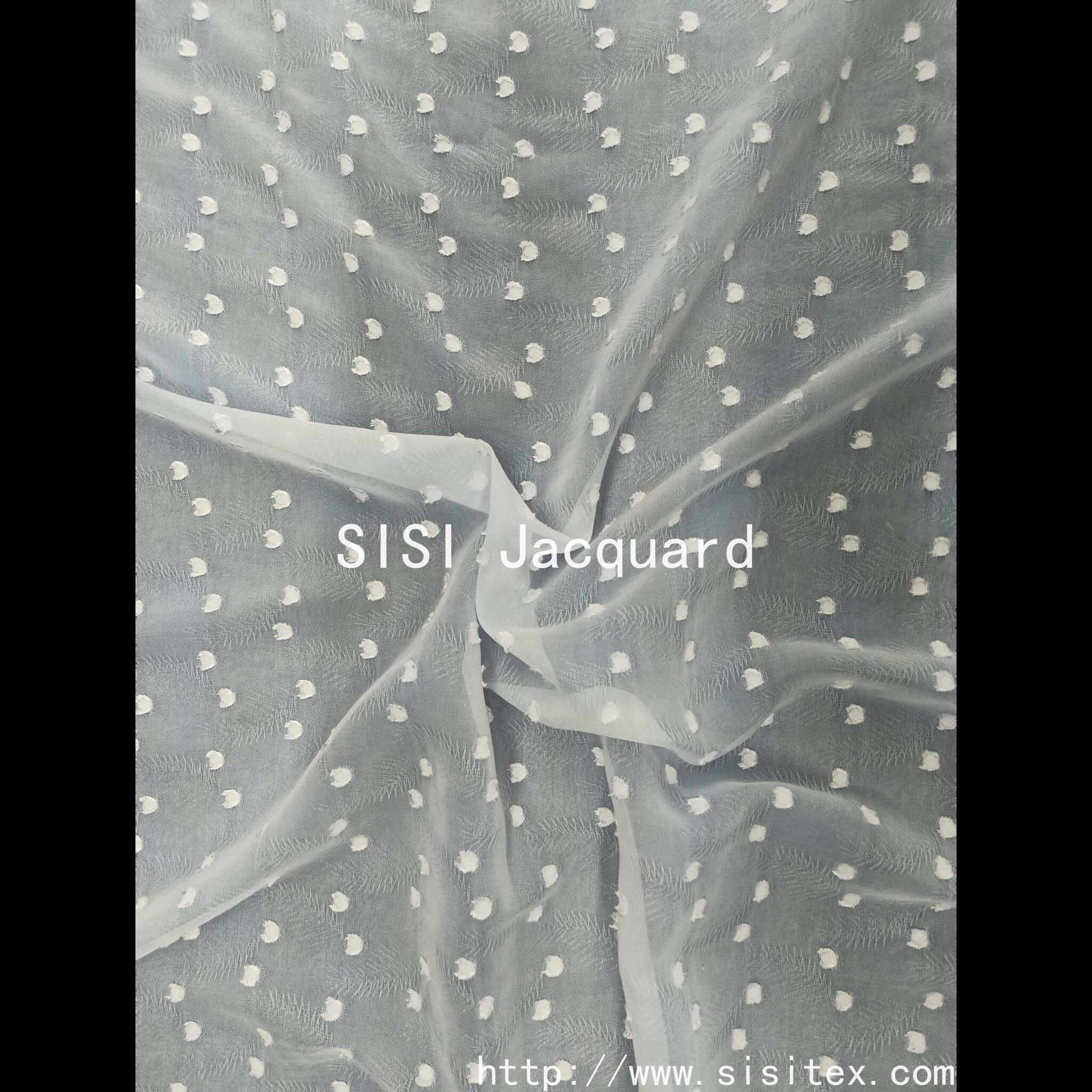 This product is made of nylon + viscose blended glass yarn **, combined with ** feather jacquard ** and ** circle cutting process **, to create a light as feathers, light as fog unique texture. The surface of the fabric is mainly visual with feather jacquard lines, supplemented by hollow circles and cut flowers, forming a three-dimensional level of virtual and real interleaving. The smooth luster of the glass yarn and the moisture absorption of the viscose complement each other, and the touch is cool and silky, perfect for spring and summer light wear and high-end home design.