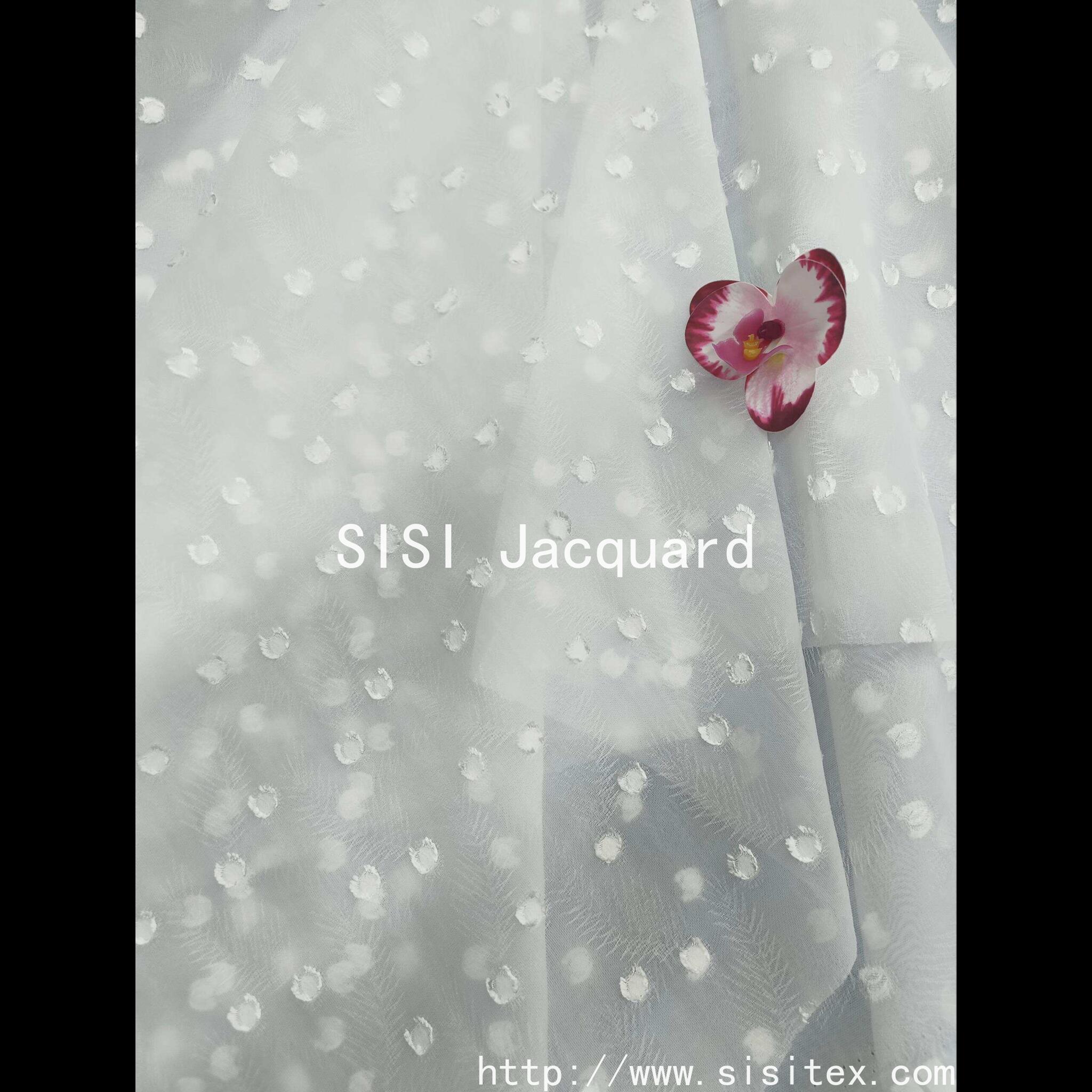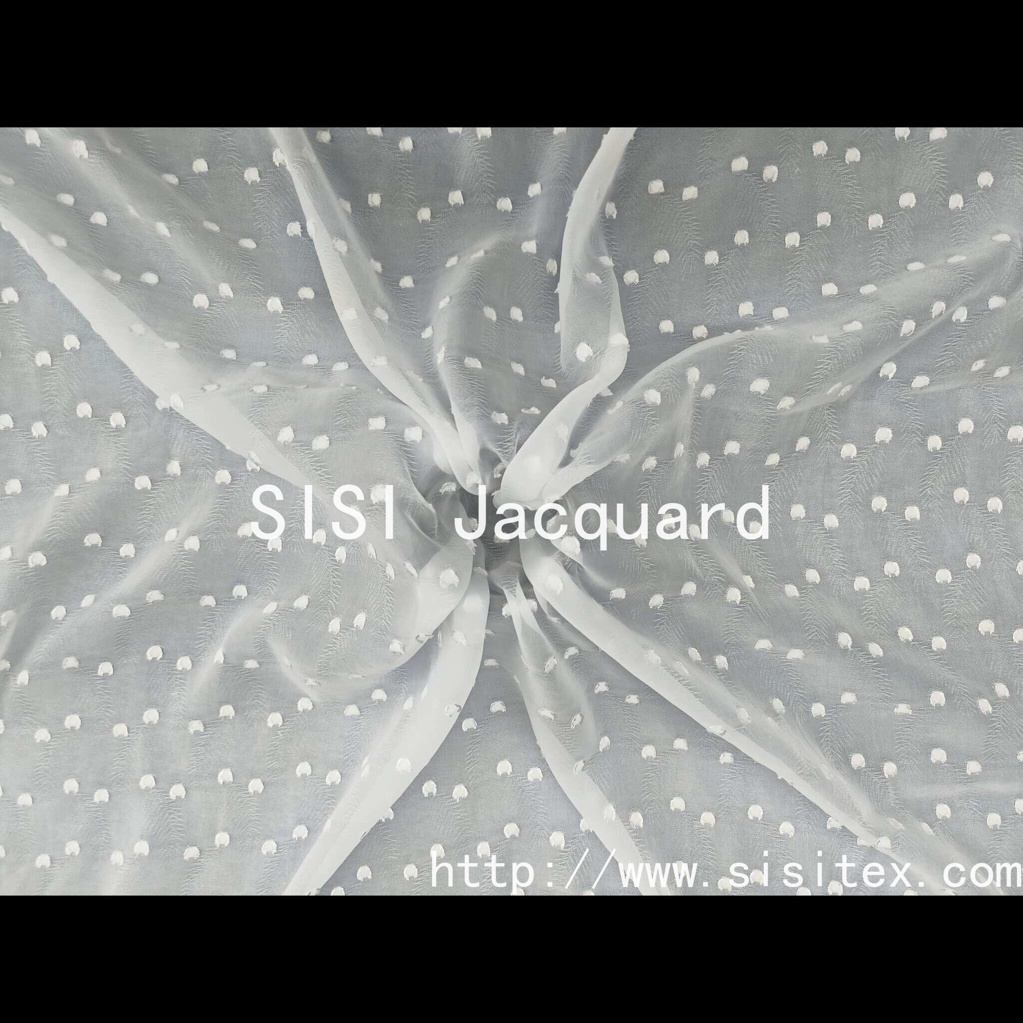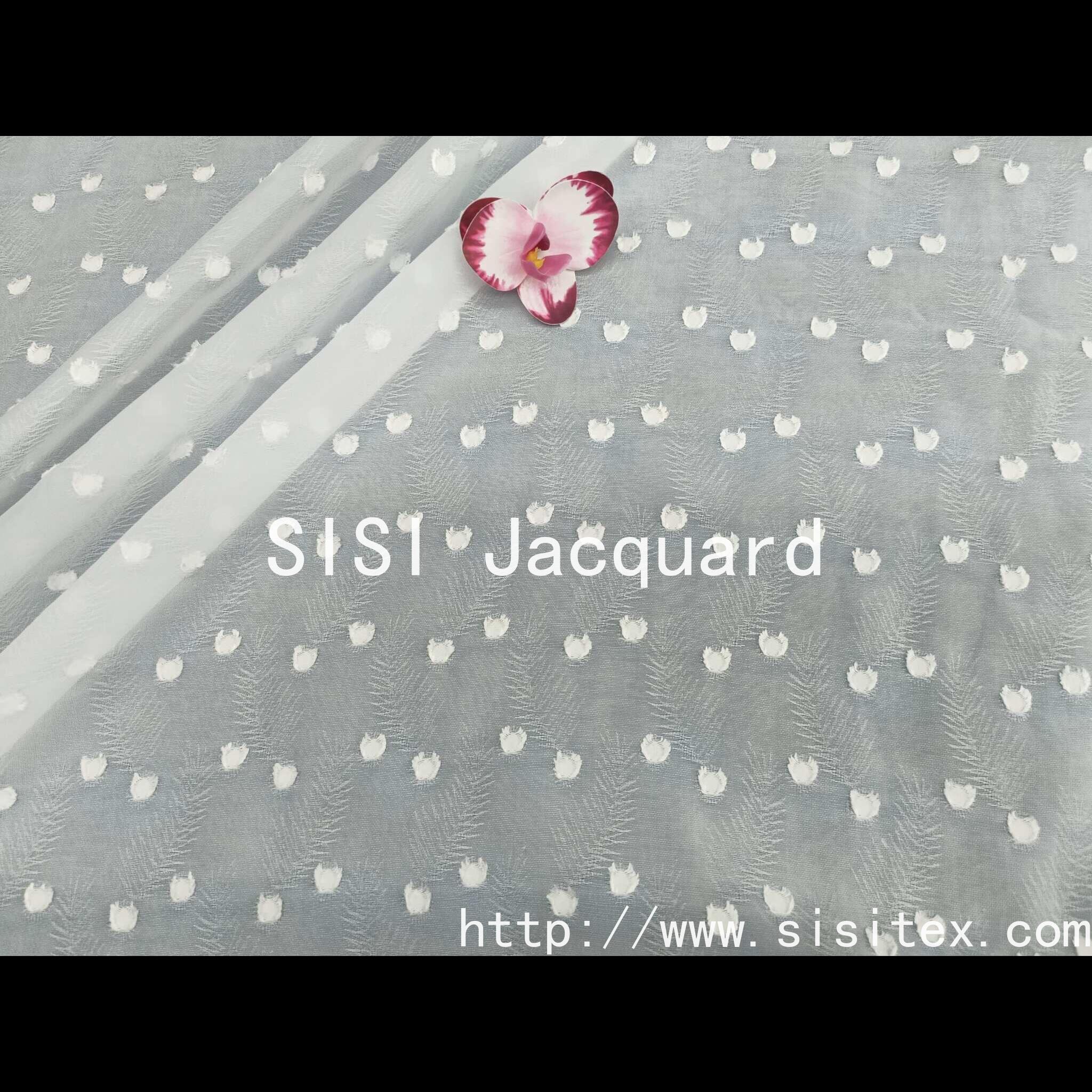 This product is made of nylon + viscose blended glass yarn **, combined with ** feather jacquard ** and ** circle cutting process **, to create a light as feathers, light as fog unique texture. The surface of the fabric is mainly visual with feather jacquard lines, supplemented by hollow circles and cut flowers, forming a three-dimensional level of virtual and real interleaving. The smooth luster of the glass yarn and the moisture absorption of the viscose complement each other, and the touch is cool and silky, perfect for spring and summer light wear and high-end home design.