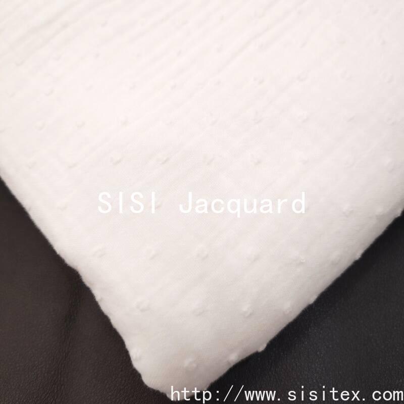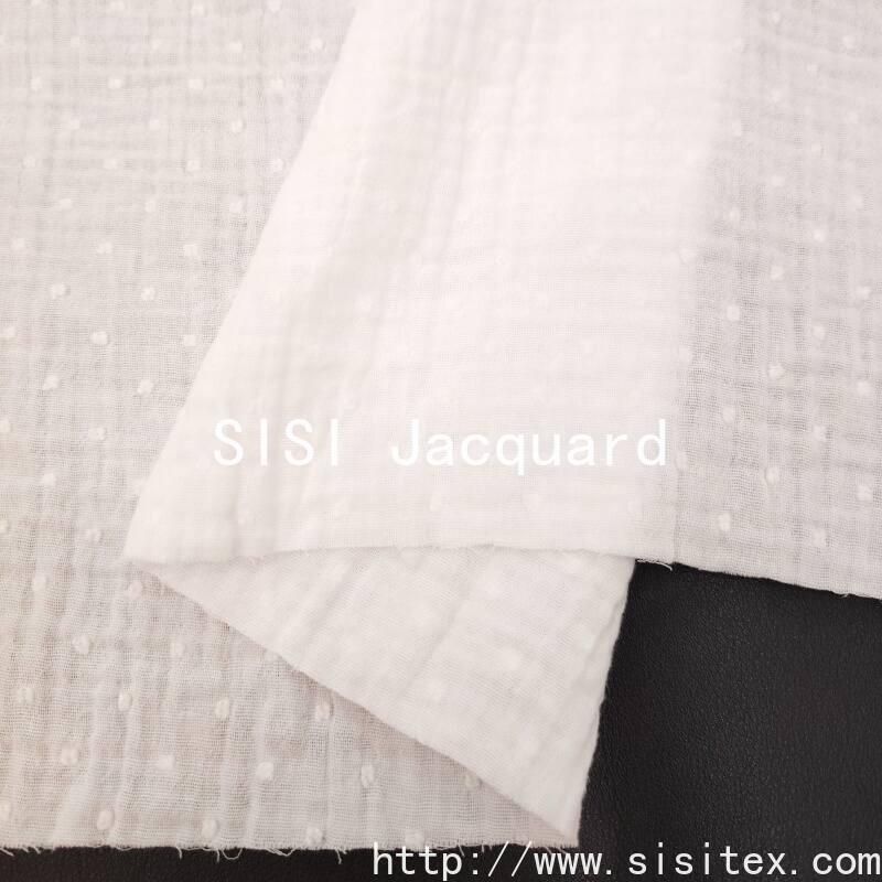 This cotton jacquard fabric is crafted with a unique **double-layer crepe weaving technique**, and is woven with delicate **dot embroidery** to create a three-dimensional relief pattern. The 100% pure cotton fabric provides a natural, skin-friendly breathability, combined with the fluffy and soft crepe texture, creating a dreamy and romantic visual layering effect, as if natural light and shadow are woven into the fabric.
