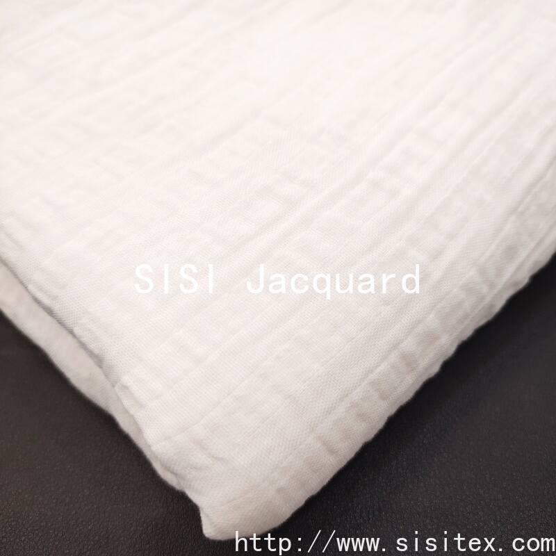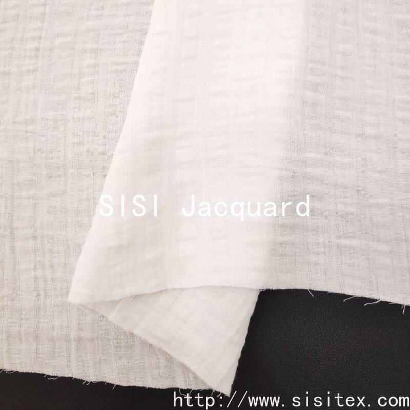 This cotton-spun double-layer jacquard fabric is woven with 80% cotton and 20% polyester blended yarns. The double-layer fabric structure creates a fine striped base, and the jacquard technique adds geometric patterns for depth. The fabric density is 125×75, with a weight of 133g/㎡. It is soft and fluffy, combining the comfort and skin-friendly texture of cotton with the smooth and draping quality of polyester. The double-layer fabric structure naturally has a slight crease, providing excellent breathability. The white base is pure and gentle, giving an overall light and modern style. It is suitable for creating comfortable and relaxed summer clothing and skin-friendly home products.