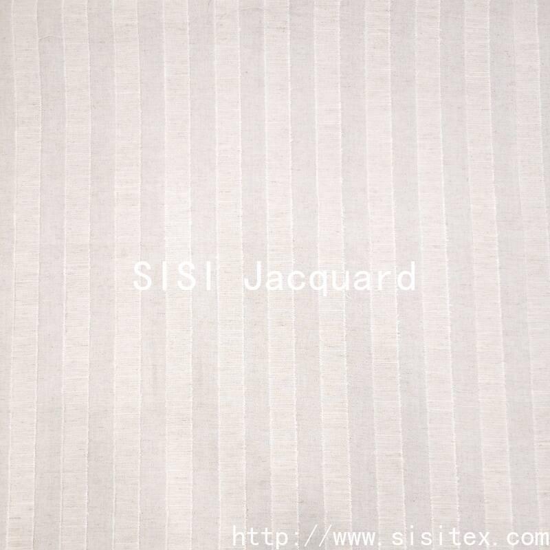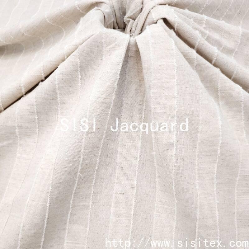 This cotton and linen vertical herringbone jacquard fabric is woven with a blend of 90% cotton and 10% linen yarns. Through the combination of jacquard and cut-out techniques, it creates a three-dimensional and lively vertical stripe pattern and texture layers. The fabric density is 120×70, with a weight of 165g/㎡. It has a thick and crisp texture, combining the softness and skin-friendliness of cotton with the natural roughness and breathability of linen. The natural linen base tone is simple and gentle. The vertical stripes and cut-out details create delicate light and shadow changes. The overall style is natural and serene, featuring Japanese-Korean style wabi-sabi aesthetics and handcrafted texture. It is suitable for creating clothing and home products that combine comfort and artistic charm.