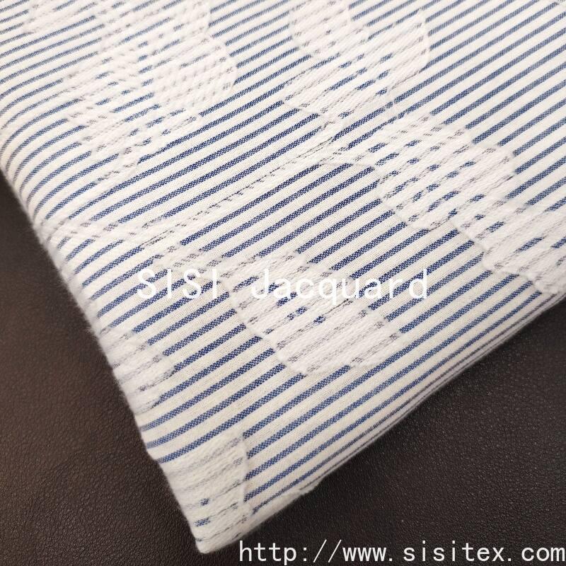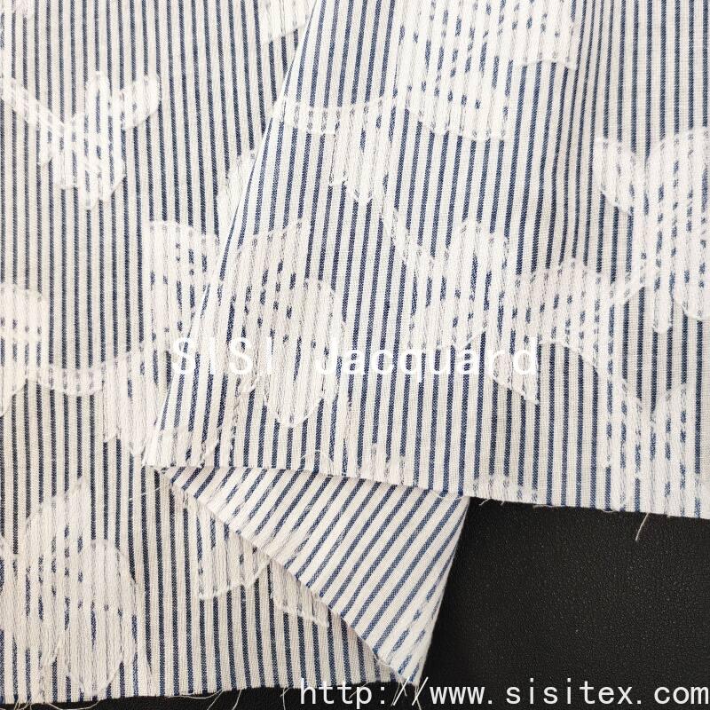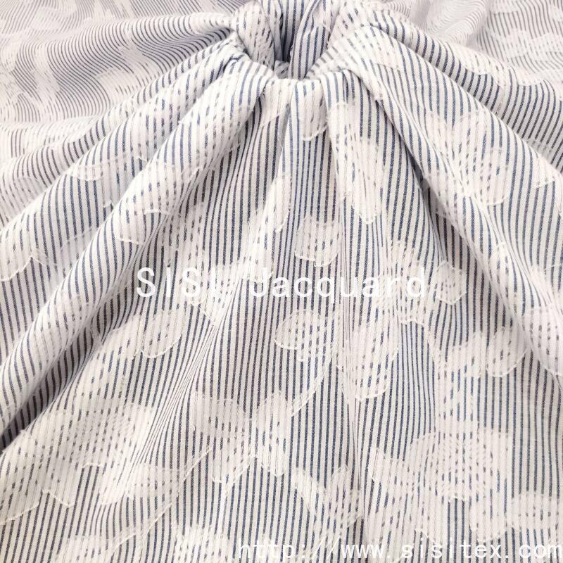This polyester-cotton striped jacquard jacquard fabric is made from 50% cotton and 50% polyester blended yarn. It is woven through a jacquard and embroidery process using a blue-white or black-white striped base fabric, creating a three-dimensional and lively geometric pattern. The fabric density is 147×62, with a weight of 119g/㎡. It has a thick and crisp texture, combining the comfort and breathability of cotton with the wrinkle resistance and durability of polyester. The striped base combined with the three-dimensional jacquard design has strong layers, distinct color contrasts, and an overall style that is simple and powerful, with an element of modern European style. It is suitable for creating clothing and home products that combine practicality and design.