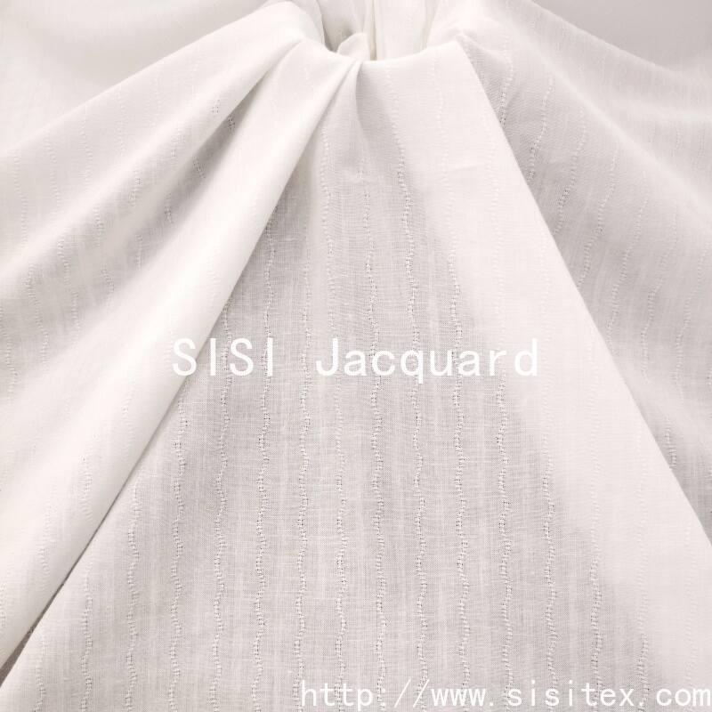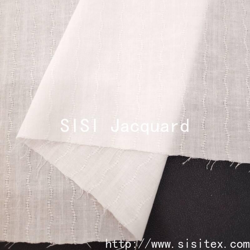 This cotton and rayon wavy jacquard fabric is made from a 50% cotton and 50% rayon blended yarn. It is woven through a jacquard process to create a smooth and undulating wave pattern. The fabric has a density of 80×65 and a weight of 88g/㎡. It is soft and lightweight, combining the comfort and skin-friendliness of cotton with the silky drape of rayon. The wave pattern is natural and flowing, with a sense of movement and rhythm. The overall style is simple and elegant, featuring modern geometric beauty and a natural flowing atmosphere. It is suitable for creating comfortable and stylish summer, autumn and spring clothing as well as fresh home accessories.