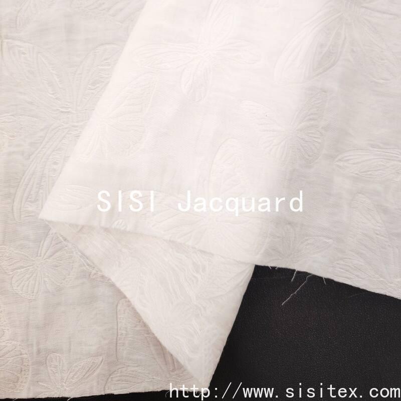 This woven blended jacquard butterfly pattern fabric is made from a composite yarn of 41% nylon, 41% cotton and 18% polyester. Through an ultra-dense weaving technique and three-dimensional jacquard process, it creates a vivid butterfly pattern like a relief sculpture. The fabric has a density of 178×183 and a weight of 159g/㎡. It is tightly and thickly textured, with a soft and flexible feel. It combines the elasticity of nylon, the smoothness and draping of cotton, and the stiffness of polyester. The butterfly pattern is lifelike, with detailed and three-dimensional wing textures, resembling an artistic relief sculpture in motion. The overall style is dreamy and magnificent, with a sense of fluidity and luxury, making it suitable for creating formal dresses, high-end women's clothing, and artistic home decorations.