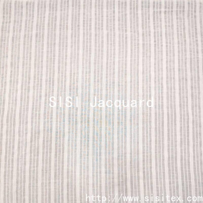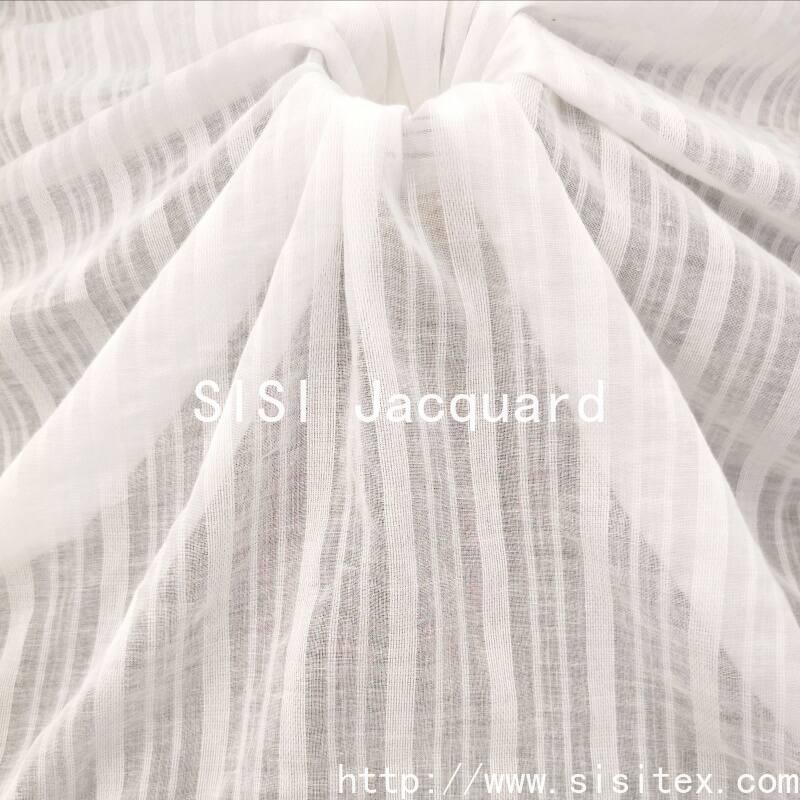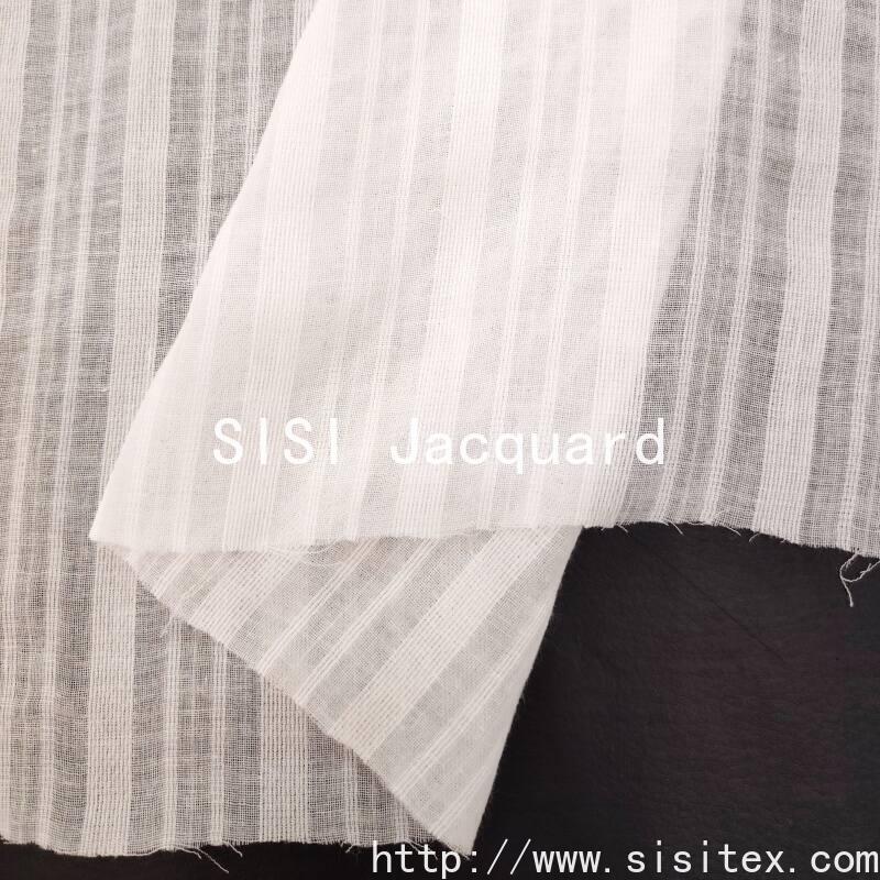 This summer and spring all-cotton muslin jacquard fabric is woven with 100% combed cotton yarn, combining traditional muslin weaving techniques with the jacquard pattern. It creates a light and transparent texture along with vertical stripe patterns. The fabric has a loose structure (density 60×60), with an extremely thin and soft texture, excellent breathability, and combines the natural skin-friendly properties of cotton with the unique creased and drapey feel of muslin. The pure cotton material has a refreshing touch, and the stripes and muslin texture interweave to create delicate layers. The overall style is natural, breathing, and light and agile, suitable for creating summer lightweight and breathable clothing and fresh home textiles.