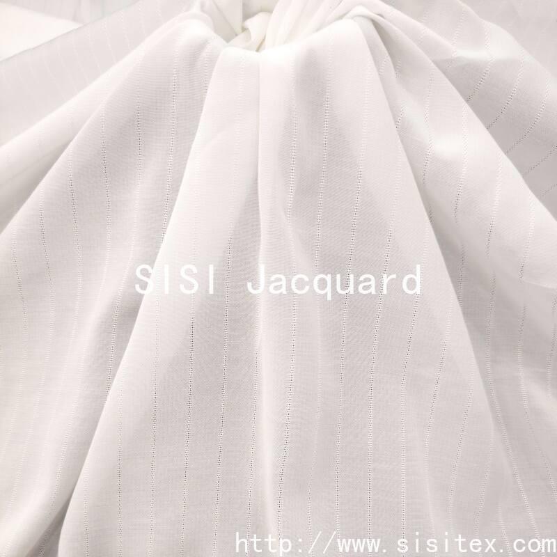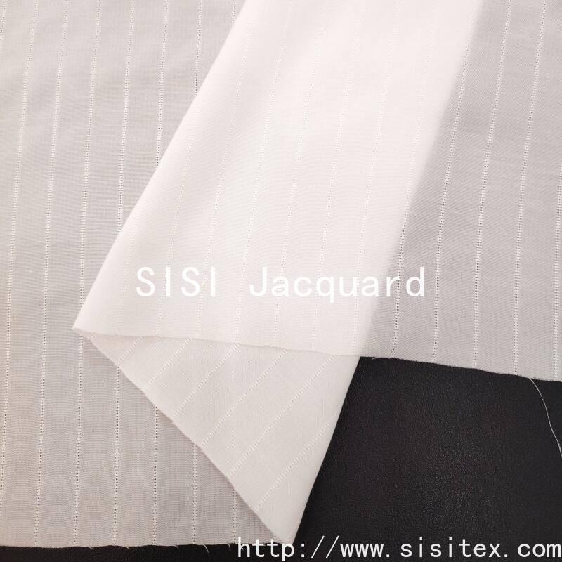 This meshed fabric with both human silk and human cotton, featuring a 100% blend of these two types of yarns, combines the technique of mesh weaving with the longitudinal striped jacquard design to create a three-dimensional effect of transparent texture, clear stripes, and local meshing. The fabric density is 96×67, with a weight of 108g/㎡. It has a soft and smooth texture, gentle luster, and combines the silky feel of human silk with the draping and breathable properties of human cotton. The stripes are neat and fine, and the meshed parts enhance the breathability and add layering effects. The overall style is light and transparent, with a modern and minimalist feel as well as a feminine and gentle charm. It is suitable for creating high-end shirts, dresses, and elegant home accessories for spring, summer, and autumn seasons.