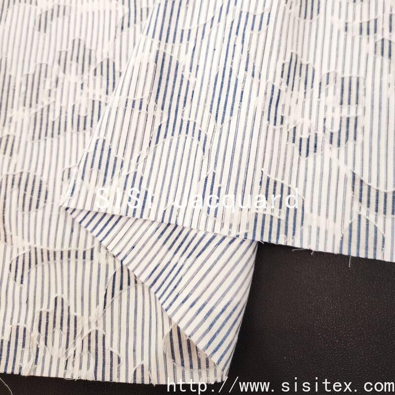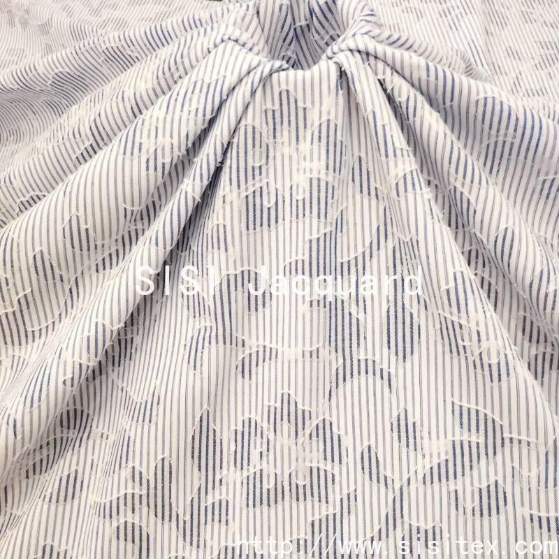 This polyester-cotton blue and white striped jacquard printed fabric is made from a blend of 35% cotton and 65% polyester yarns. It is woven through a dyeing process to create a classic blue and white striped base, and then combined with jacquard and print techniques to form a three-dimensional and lively plant and flower pattern. The fabric density is 150×64, with a weight of 151g/㎡. It has a crisp and thick texture, combining the durability and wrinkle resistance of polyester with the comfort and breathability of cotton. The blue and white stripes are refreshing and bright, with a clear color contrast. The jacquard and print parts are delicate and rich. The overall style combines the freshness of the ocean and the natural romance, and has an elegant modern touch. It is suitable for creating practical and stylish clothing and home products.