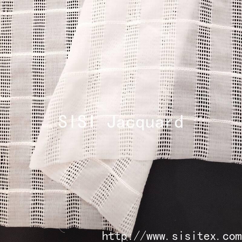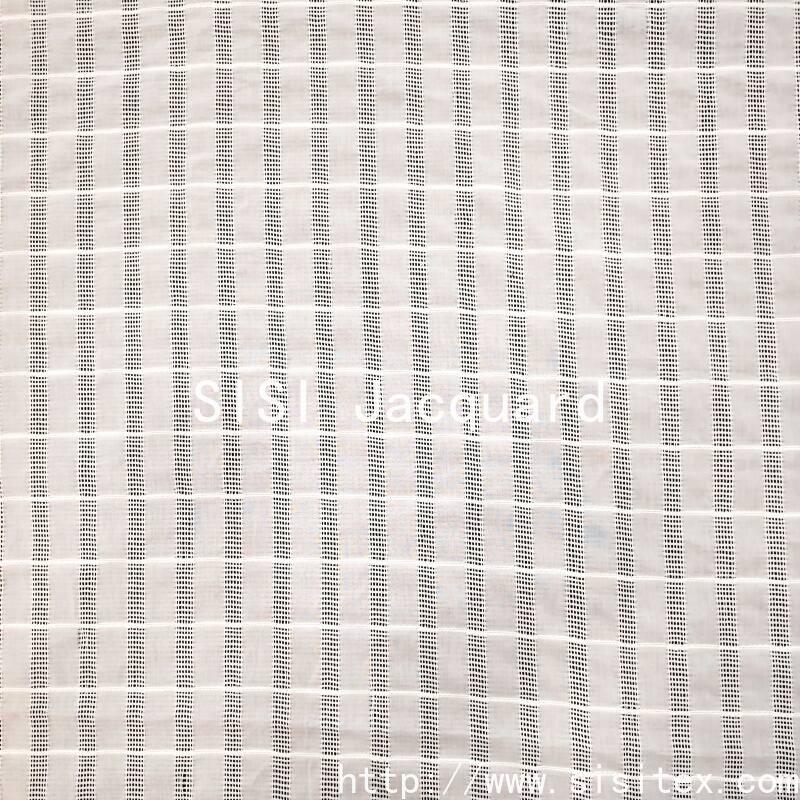 This cotton-spun mesh perforated striped jacquard fabric is made from a blend of 80% cotton and 20% rayon yarns. It combines mesh weaving, perforation techniques, and vertical striped jacquard to create a three-dimensional layering effect of transparent grids, clear stripes, and local perforations. The fabric has a loose structure (with a density of approximately 60×60), weighing 112g/㎡. It is lightweight and soft, combining the comfort and skin-friendliness of cotton, the smoothness and drape of rayon, and the ultimate breathability of mesh perforations. The stripes are neatly defined, the mesh is fine and uniform, and the overall style is refreshing and transparent, with modern structural beauty and a sense of breathability. It is suitable for creating light, comfortable, and stylish clothing and home textiles for spring and summer.