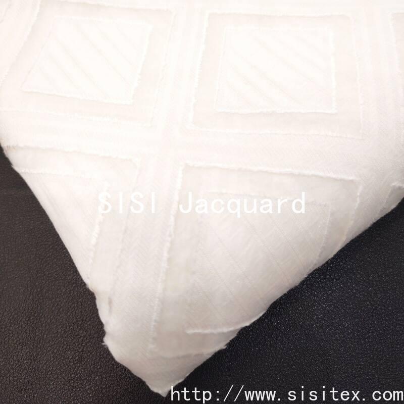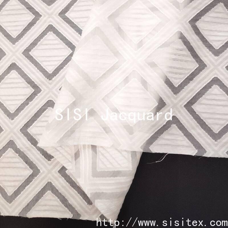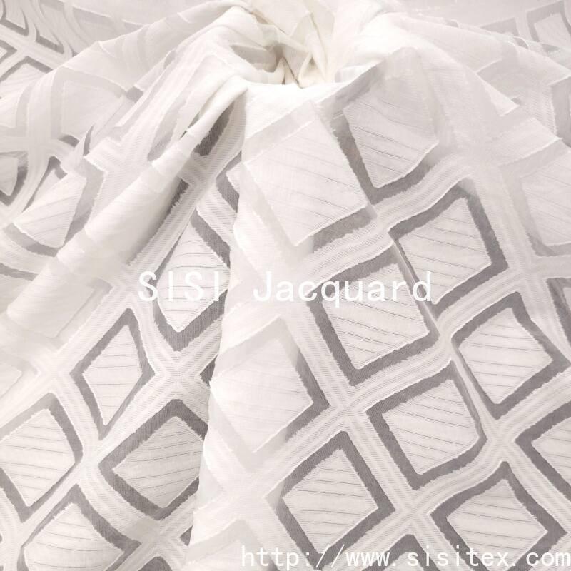 This fabric is made by blending 30% nylon and 70% viscose. Through the combination of precise jacquard and die-cutting techniques, it is woven into a three-dimensional diamond-shaped geometric pattern with distinct surface texture. The fabric has a clear surface texture, a smooth touch and a natural luster. It has a moderate weight (104g/㎡), a width of 145cm, and combines a sense of drape with a lightweight texture. It is suitable for creating modern design clothing and home accessories.