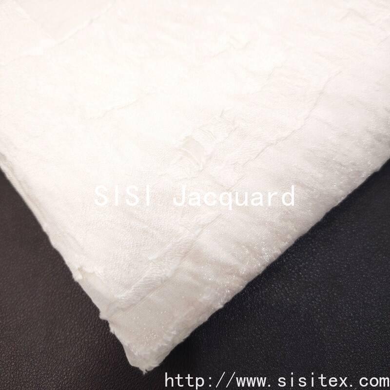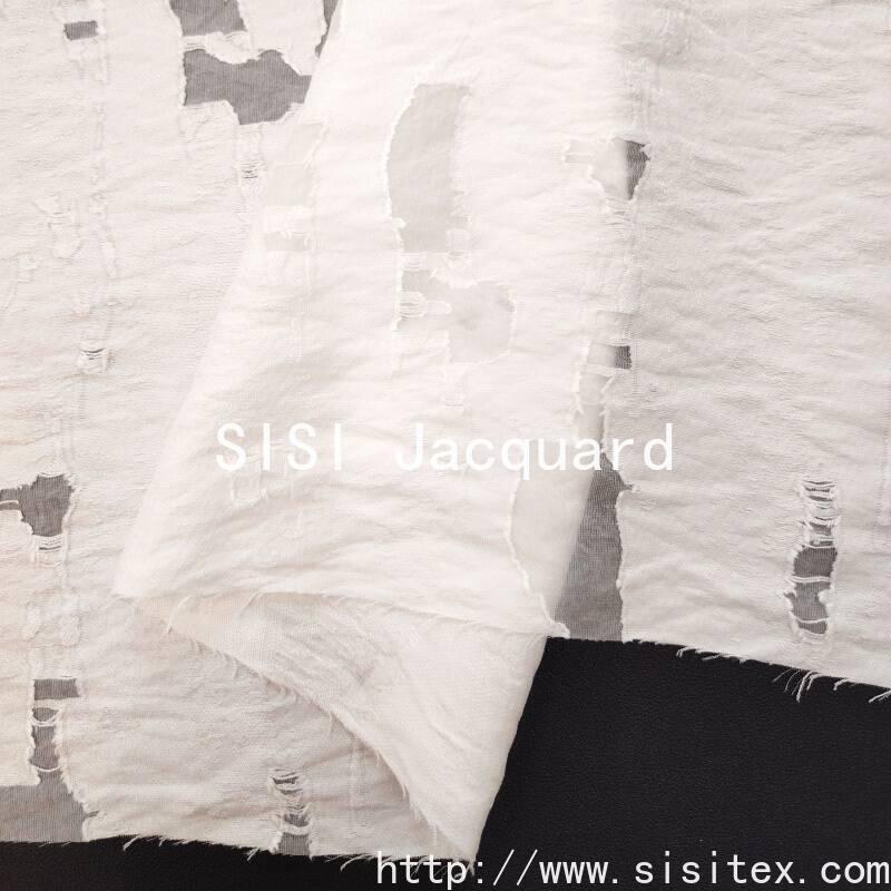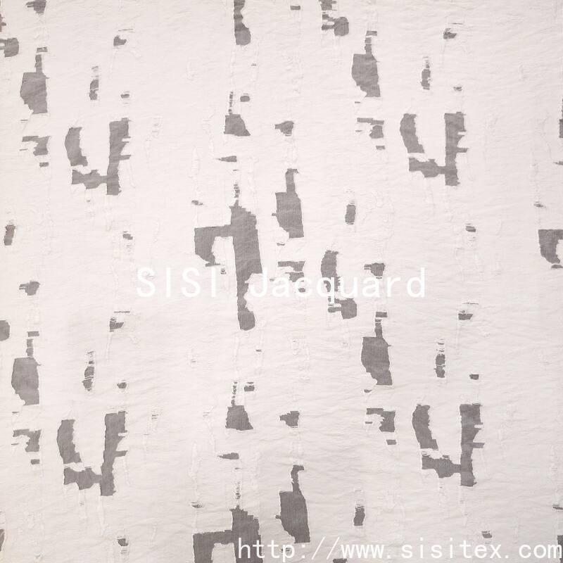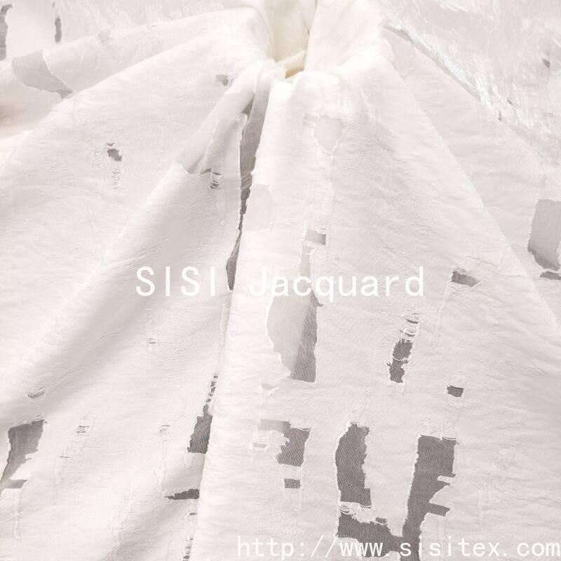 This cotton-viscose jacquard flower fabric is made by blending 68% viscose and 32% nylon. It is woven using a jacquard cutting technique to create irregularly hollowed-out flower patterns, resulting in a naturally distributed perspective texture. The fabric weighs 123g per square meter, has a width of 145cm, and has a lightweight and smooth texture with excellent draping properties. The hollowed-out parts are partially visible, giving the overall style a blend of retro elegance and modern fluidity. It is suitable for creating clothing and soft furnishing works with a breathing effect and layered design.