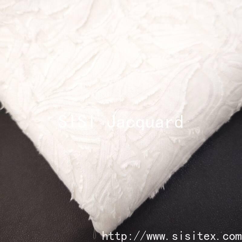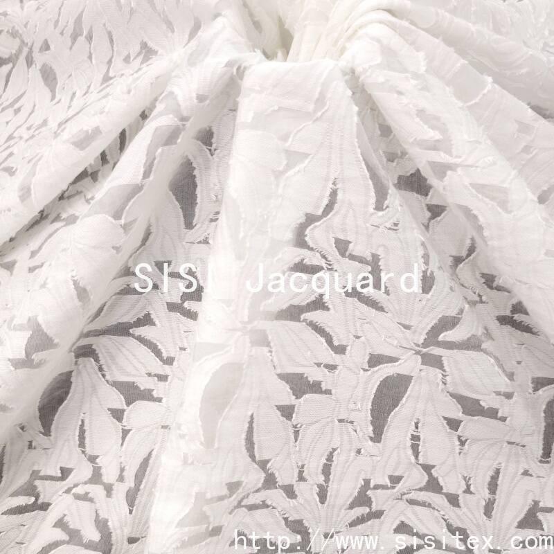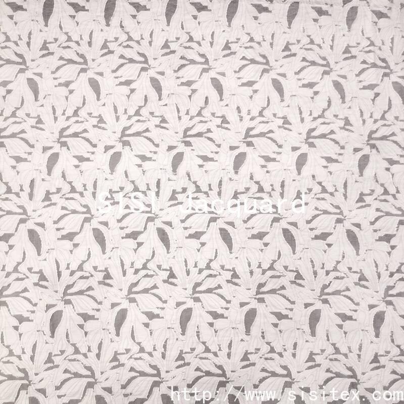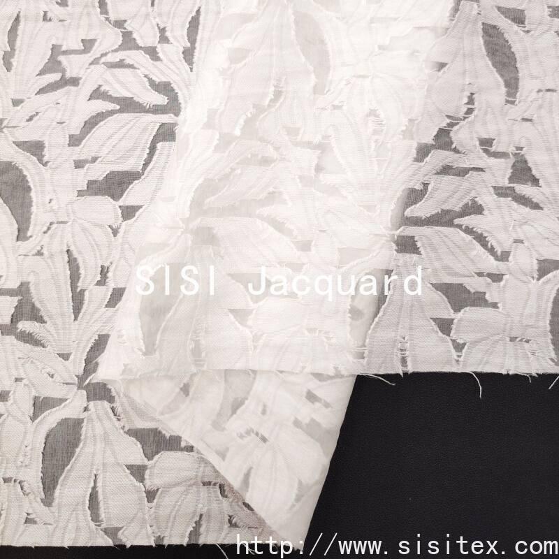 This fabric is made by blending 63% cotton and 37% nylon. Through jacquard and cutting techniques, it creates a delicate leaf pattern and a slightly translucent organza texture. The fabric weighs 107g per square meter and has a width of 145cm. It is lightweight and smooth to the touch. The leaf patterns are clearly three-dimensional, combined with faintly visible perforated textures. Overall, it presents a style that combines natural elegance and refined sophistication, suitable for creating fashionable designs that combine both daily commuting and light formal wear aesthetics.