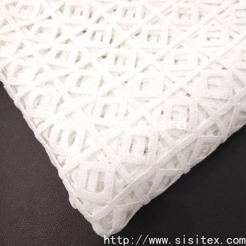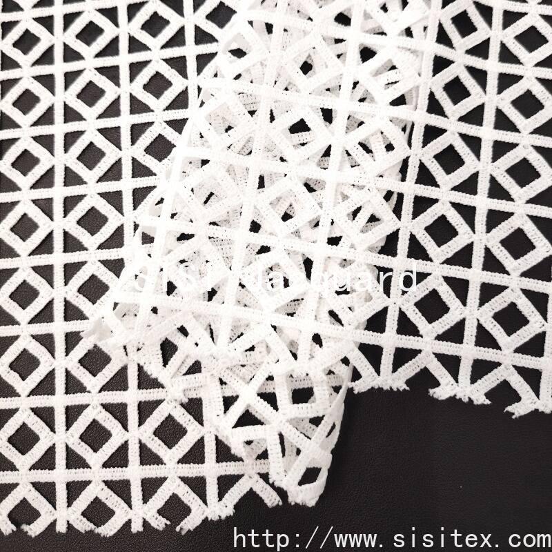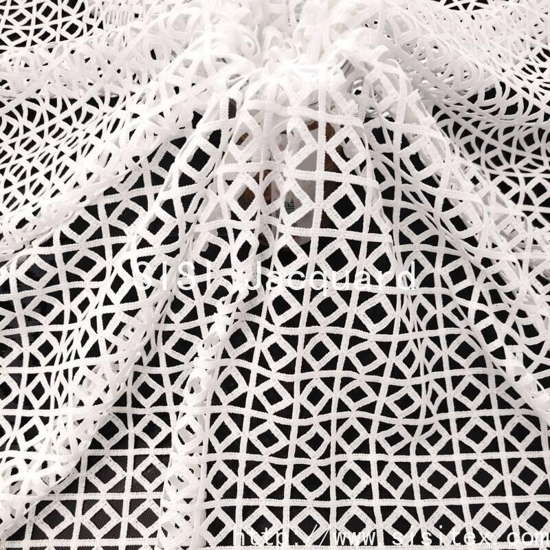Three-dimensional geometric grid water-soluble embroidery: The grid pattern is presented as transparent and hollow through water-soluble embroidery, with distinct layers and a three-dimensional texture.