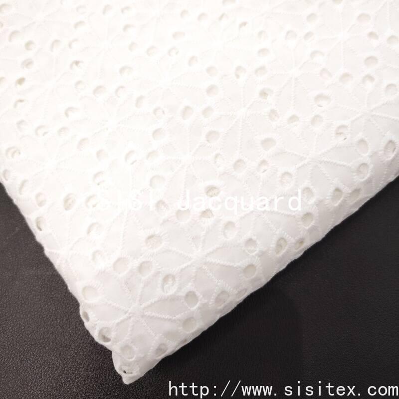 This fabric is made of 100% combed cotton (JC60×JC60). Through a meticulous镂空 embroidery technique, a full-patterned plant flower-shaped perforation pattern is embroidered onto the fabric. The embroidered holes are evenly and delicately distributed, with a natural and soft flower shape, creating a transparent yet flexible texture. The fabric width is 135cm. It has a soft and skin-friendly texture, with cotton fibers providing excellent breathability and moisture absorption. The overall style is fresh and artistic, featuring a natural breathing sensation and artisanal warmth. It is suitable for summer shirts, dresses, and elegant home accessories.