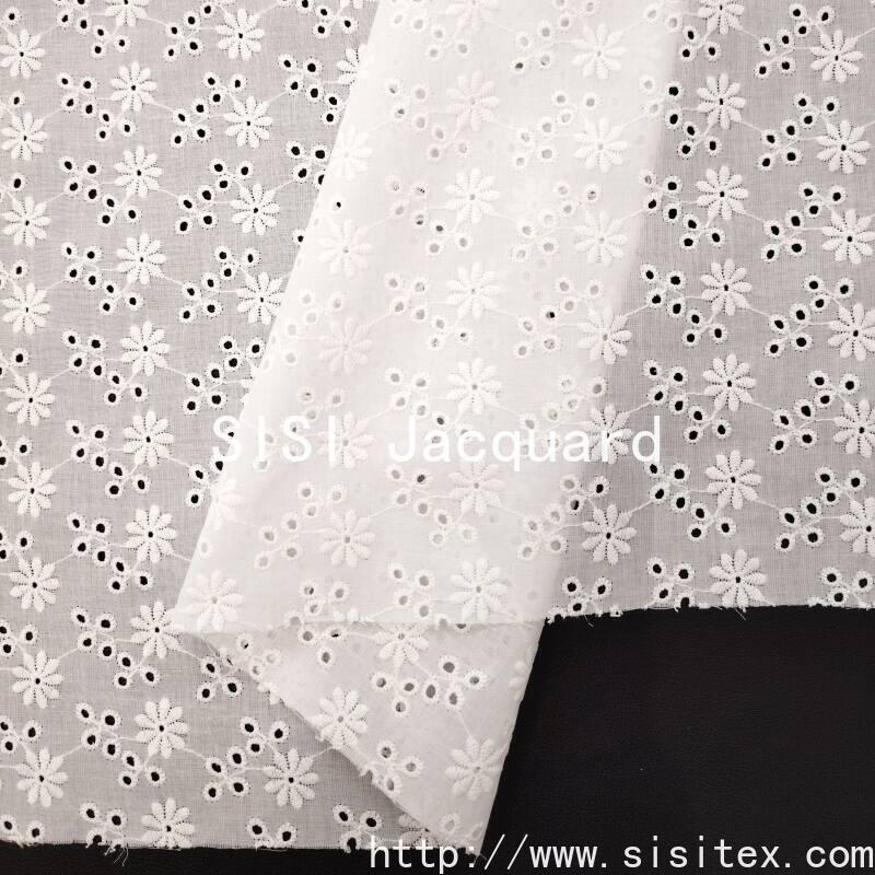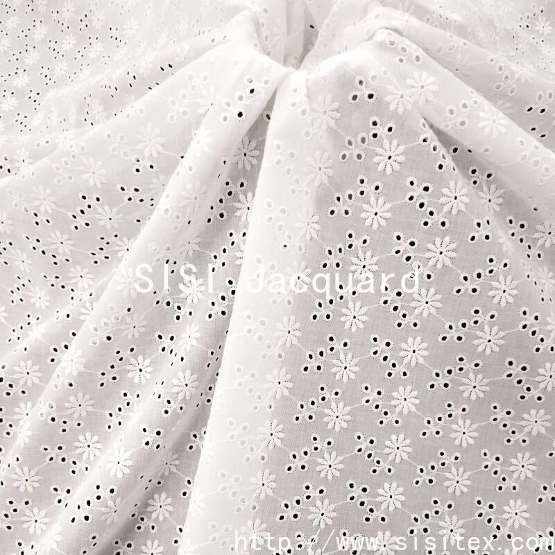 This fabric is made of 100% combed cotton (JC60×JC60) and is woven through a meticulous镂空 embroidery technique, creating a brilliant and cheerful sunflower pattern. The embroidery holes are fine and orderly, the flower shape is full and lively, forming a transparent and three-dimensional texture, as if sunlight is penetrating the petals. The fabric is soft and comfortable to the skin, with cotton fibers providing excellent breathability and comfort. The overall style is vibrant and fresh, full of natural vitality and the warmth of craftsmanship. It is suitable for creating summer dresses, shirts, and bright home accessories.