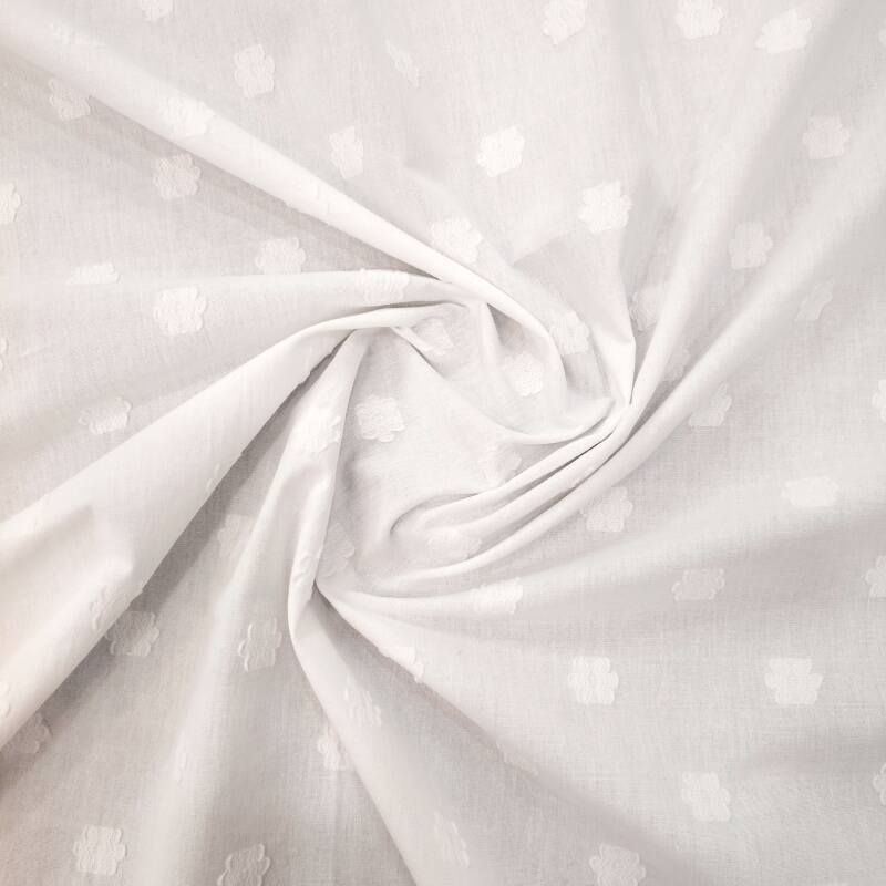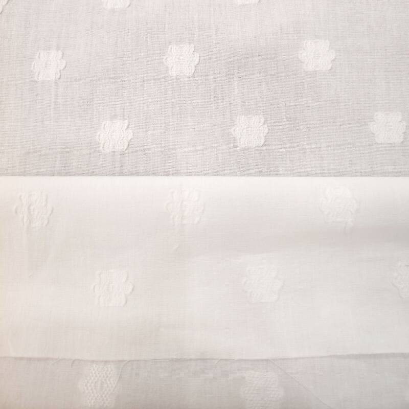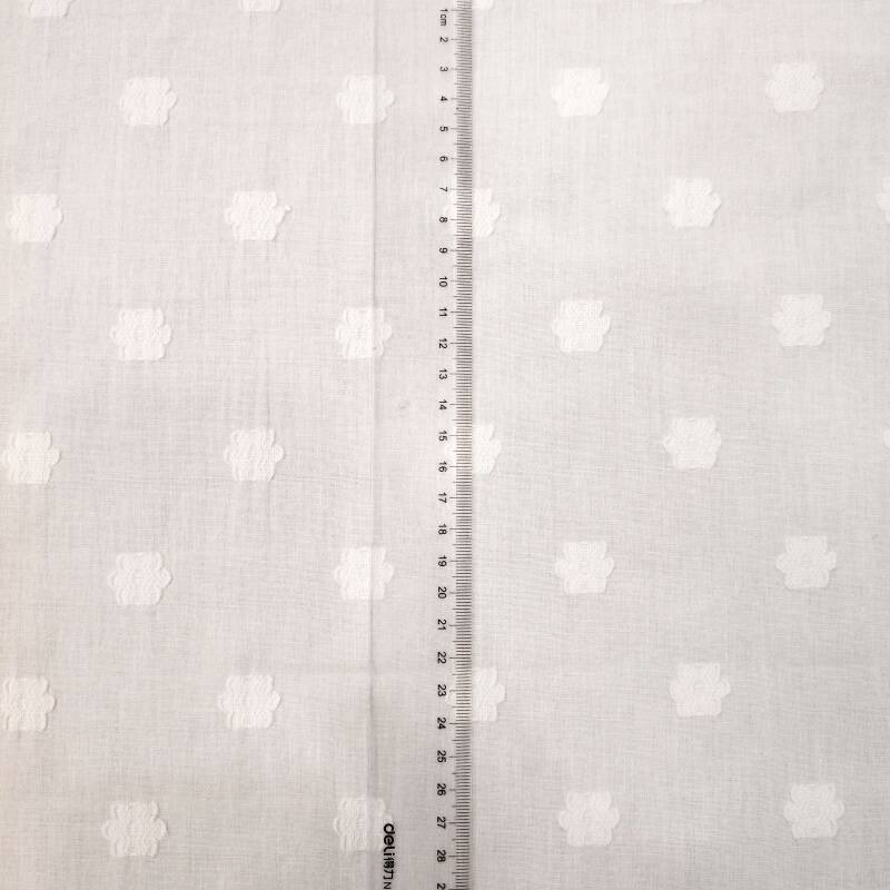 这款面料采用87%棉与13%涤纶的黄金配比,既保留了棉的天然柔软与透气性,又融入了涤纶的抗皱保形优势。通过精密的提花织造工艺,在面料表面呈现出浮雕般的立体花朵图案,纹理清晰,层次丰富,触感细腻。独特的剪花设计,在提花基础上增加了若隐若现的镂空效果,使面料更具轻盈感和设计感。光影流转间,花朵图案凹凸有致,既有手工般的艺术气质,又不失现代面料的挺括与耐用。无论是优雅长裙还是简约上衣,都能通过这款面料展现独特的质感美学,是设计师打造高端女装的理想之选。