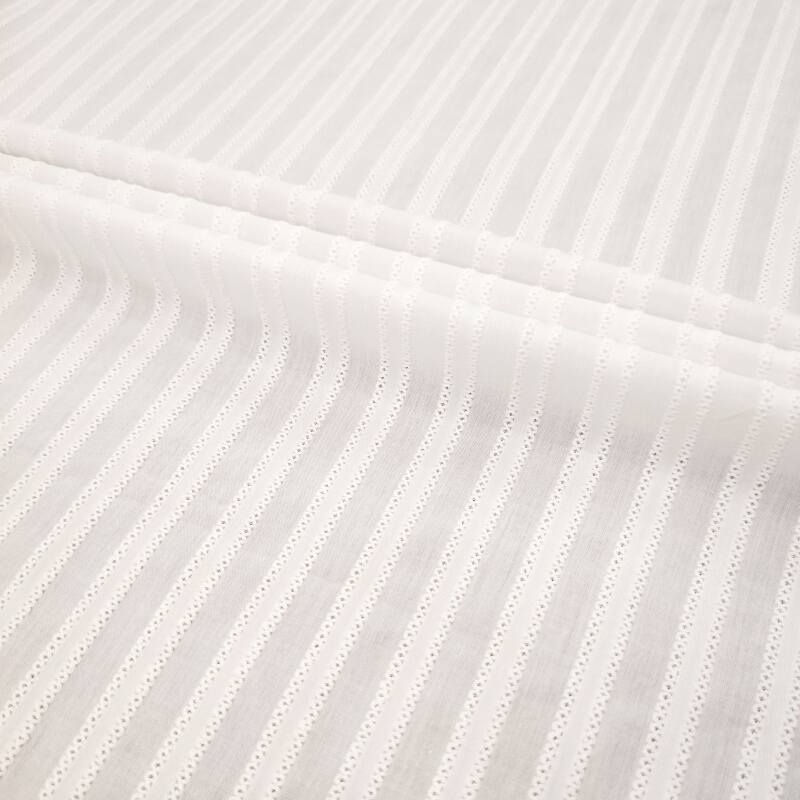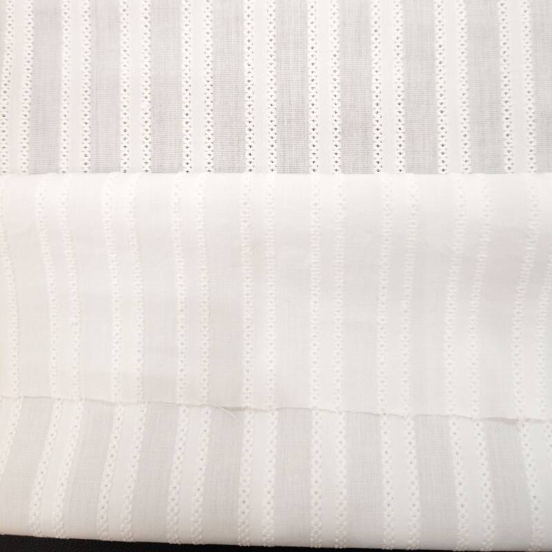 这款面料采用100%全棉为基底,通过精密的提花织造工艺,在面料表面呈现立体的麻花条纹理。纹理清晰,凹凸有致,形似编织的麻花辫,既有复古的手工韵味,又充满现代设计的秩序美感。全棉材质保留了天然的柔软触感和透气性,而麻花条提花的加入则为面料赋予了丰富的立体肌理和挺括筋骨。纵向条纹设计在视觉上拉长身形,简约而不简单,是春夏季节打造质感穿搭的理想之选。