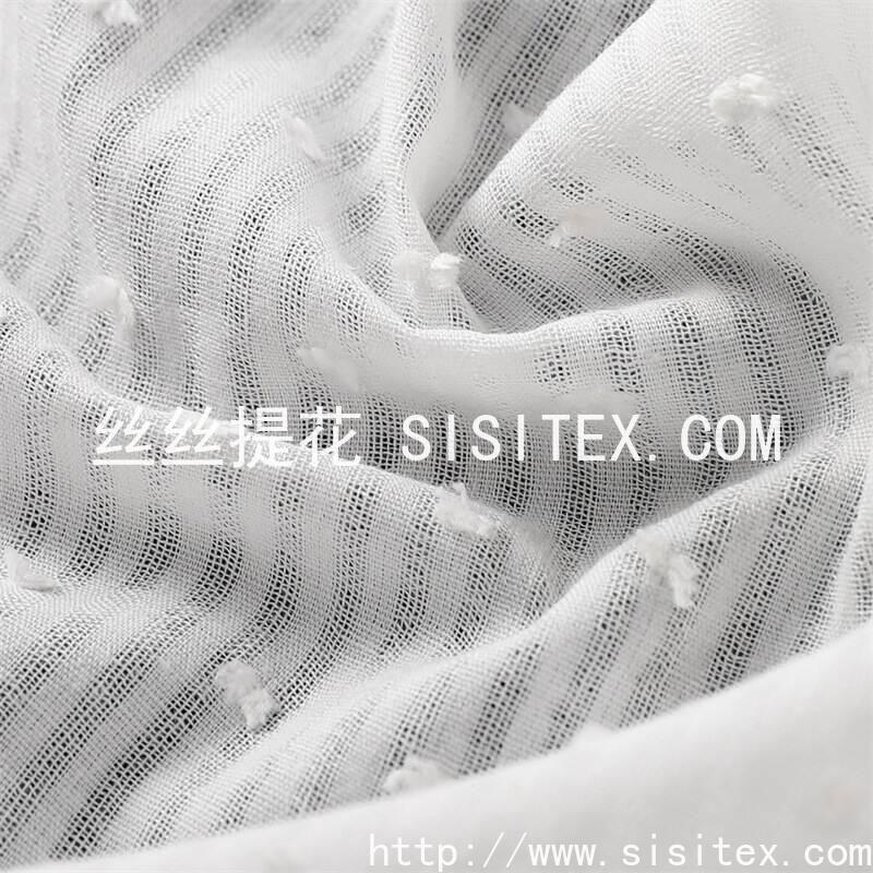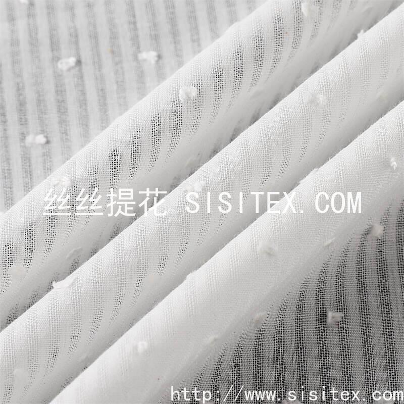 本款面料采用100%优质棉纤维,通过**空扣条织造工艺**与**纱罗结构**结合,形成独特的透气镂空纹理;表面点缀立体**毛球剪花**装饰,搭配精致的**提花图案**,兼具视觉层次感与触觉趣味性。面料柔软亲肤,吸湿透气,完美平衡了装饰性与实用性。